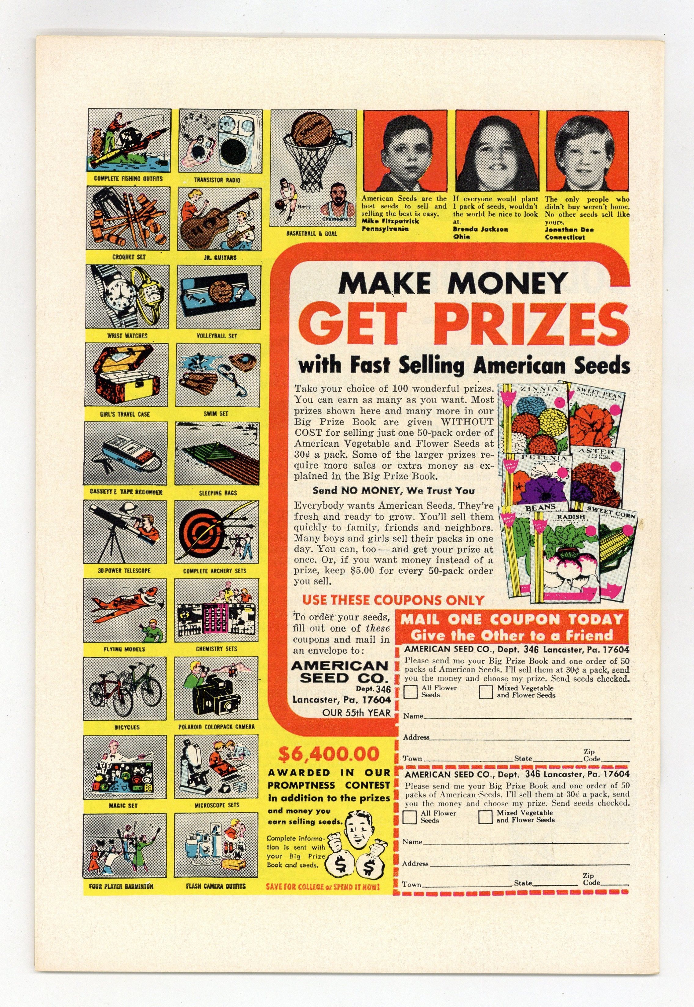 Ends Mar 23 9:44 PM CST Bid History 2 bids Current Bid $9 Your Secret Max Bid If you'd like to bid, please log in or register. Cover by Jack Kirby and Dick Ayers. Music to Scream By, script by Stan Lee and Ernie Hart [H. E. Huntley], art by Don Heck; Ant-Man and the Wasp are caught by the music of Trago, the trumpet player, who has learned some mystic use of his trumpet in India. The Disappearance text story. The Smiling Gods!, script by Stan Lee and Larry Lieber, art by Larry Lieber and Matt Fox; Asian farmers pray to their gods for a good crop to appease their cruel overlord, and their grain grows so rapidly that it entangles and crushes him. Target...Earth!, script by Stan Lee, art by Steve Ditko; An alien lands on Earth with the intent of sizing up possible resistance to an invasion force. 36 pgs., full color. $0.12. Cover price $0.12.