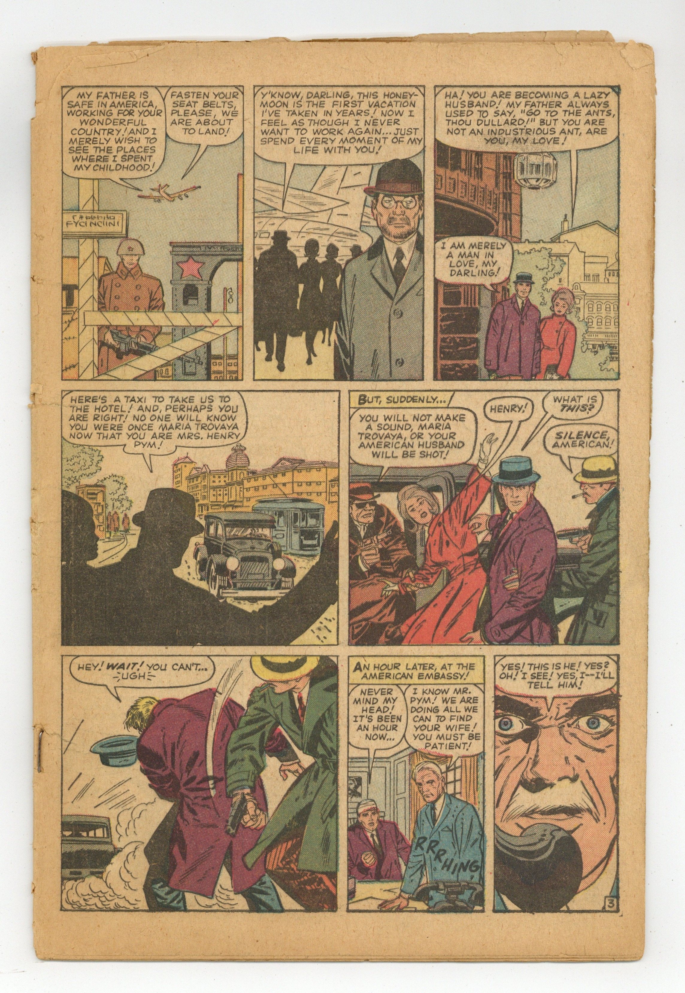Ends Mar 23 9:44 PM CST Bid History 6 bids Current Bid $29 Your Secret Max Bid If you'd like to bid, please log in or register. Cover by Jack Kirby and Dick Ayers. Return of the Ant-Man, Part 1, script by Stan Lee and Larry Lieber, art by Jack Kirby and Dick Ayers; Henry Pym invents an anti-radiation gas, that attracts the attention of communist spies. Strange Encounter, art by Joe Maneely; An American tourist in Paris is unwittingly targeted by a spy as an intelligence courier and is nearly killed. Return of the Ant-Man Part 2: An Army of Ants, script by Stan Lee and Larry Lieber, art by Jack Kirby and Dick Ayers; Henry Pym learns how to command ants to do his bidding and frees his captured assistants, with the help of the ants. Return of the Ant-Man Part 3: The Ant-Man's Revenge!, script by Stan Lee and Larry Lieber, art by Jack Kirby and Dick Ayers; Henry Pym invents an anti-radiation gas, that attracts the attention of communist spies. The Doorway to Nowhere!, script by Stan Lee, art by Steve Ditko; After escaping from jail, Hugo Cragg heads for a deserted mansion to hide out until the heat is off. The Thing from Outer Space!, art by Don Heck. 36 pgs., full color. $0.12. Cover price $0.12.