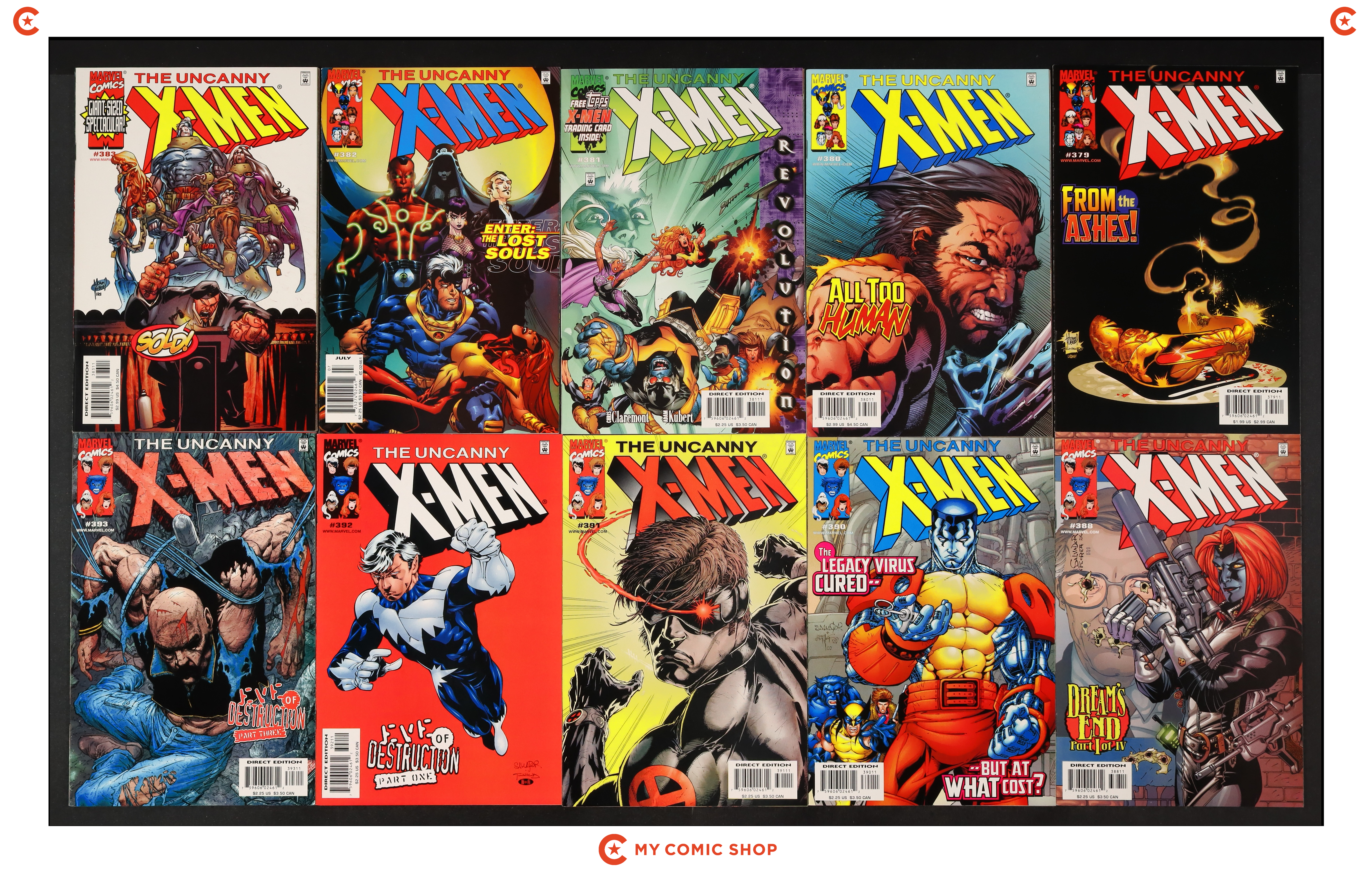 Issues 351, 352D, 353, 354A, 364, 367, 370, 371, 375, 376N, 379, 380U.D, 381A.D, 382, 383, 388D, 390, 391, 392, and 393 of Uncanny X-Men (1963 1st Series). Most will grade in the FN to VF range with #354 grading VG/FN.