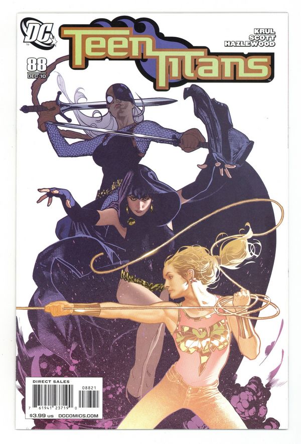 Starts Mar 2 Limited 1 for 10 Variant cover by ADAM HUGHES. Written by J.T. KRUL Art by NICOLA SCOTT & DOUG HAZLEWOOD It's here! A new day dawns for the Teen Titans, brought to you by the dynamic duo of J.T. Krul (GREEN ARROW, BLACKEST NIGHT: TITANS) and Nicola Scott (WONDER WOMAN, SECRET SIX)! Packed with action, steeped in emotion and featuring your favorite heroes, TEEN TITANS is ready to explode off the racks! Starting right here, the team finds itself pushed in new directions and brought to new heights while also rediscovering its roots. With the rise of a mysterious new threat called the Feral Boys, Superboy, Wonder Girl, Kid Flash, Raven, Beast Boy and the newly returned Ravager will have the chance to rebuild their camaraderie in the face of all that might endanger it. But if they discover the truth behind the Feral Boys, will they be able to stand together to face it? Find out here as the new era of the Teen Titans begins in this perfect jumping-on-point issue! 40 pg, FC, Cover price $3.99.