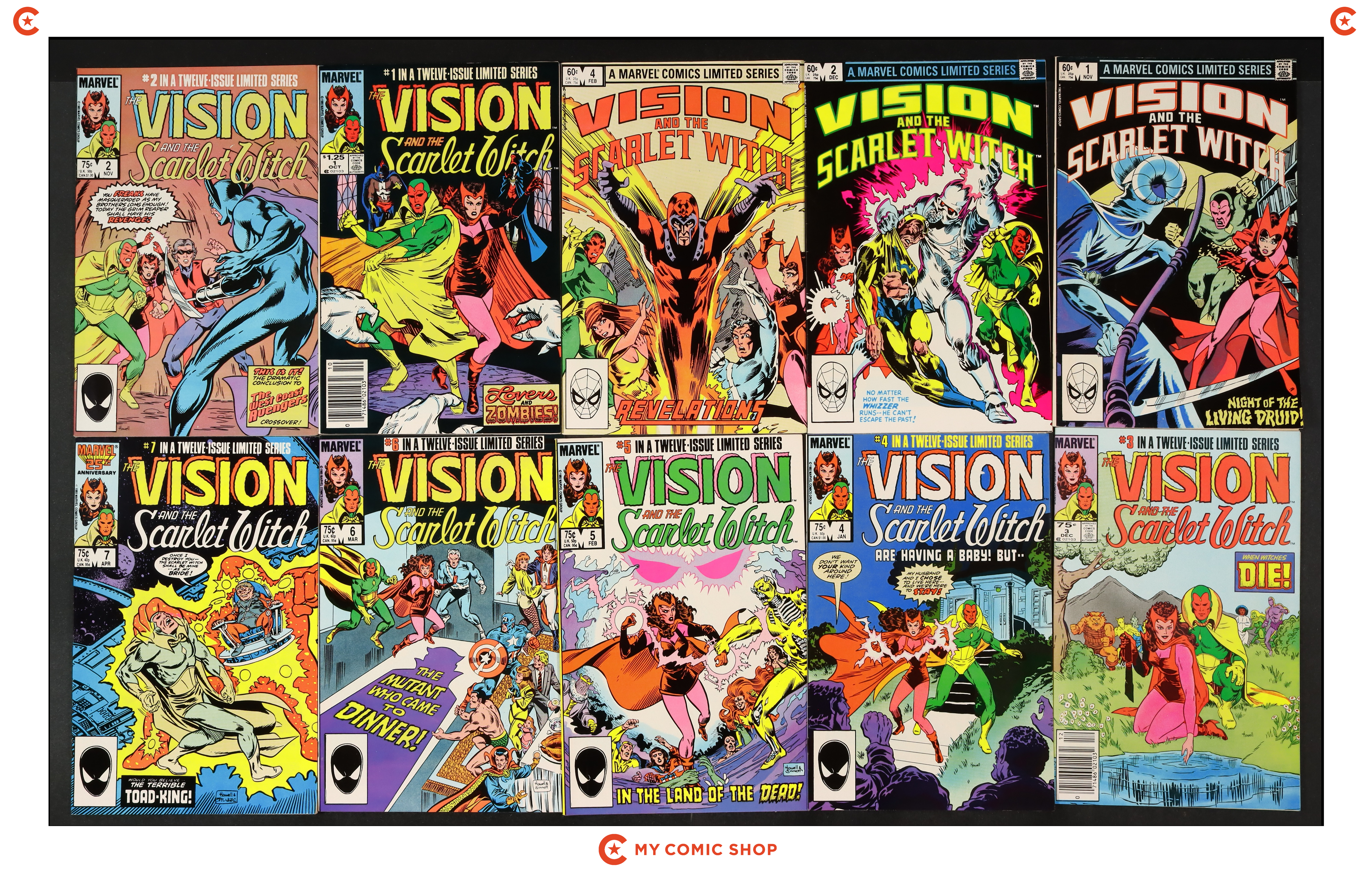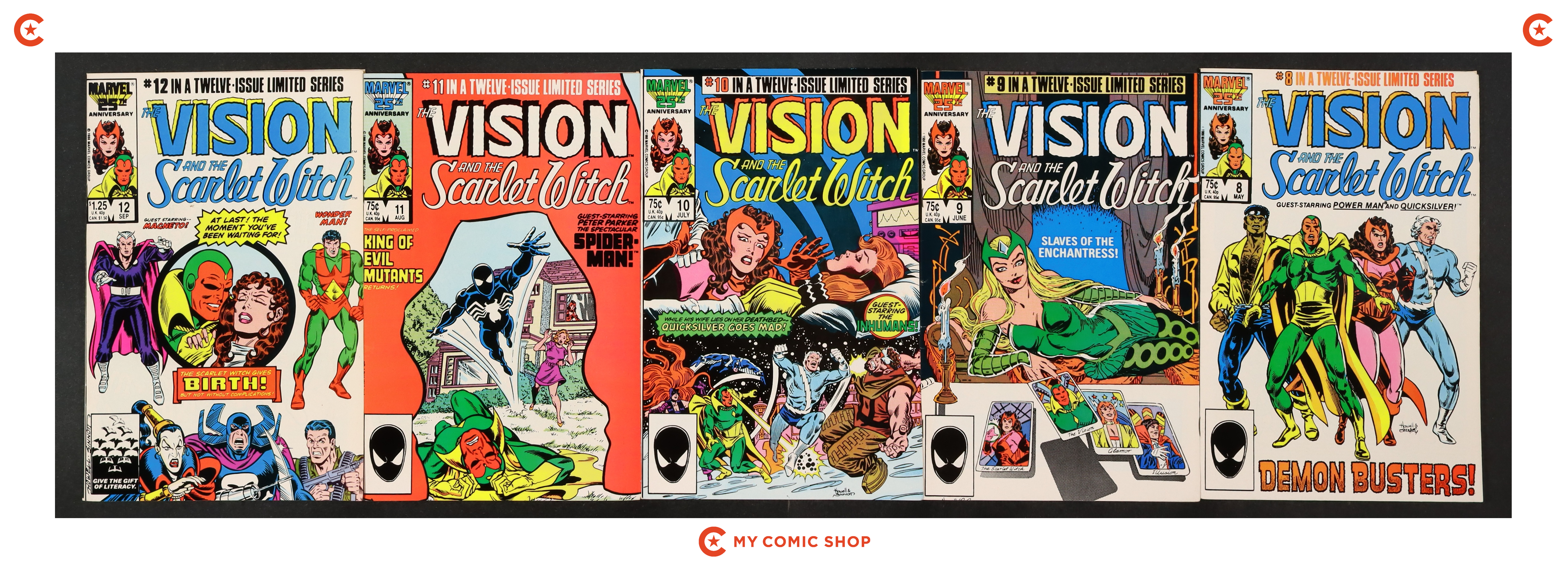 Issues 1D, 2, 4D of Vision and the Scarlet Witch (1982 1st Series), and Issues 1N-12 of Vision and the Scarlet Witch (1985 2nd Series). Most will grade in the FN to VF range with #7 grading VG.
