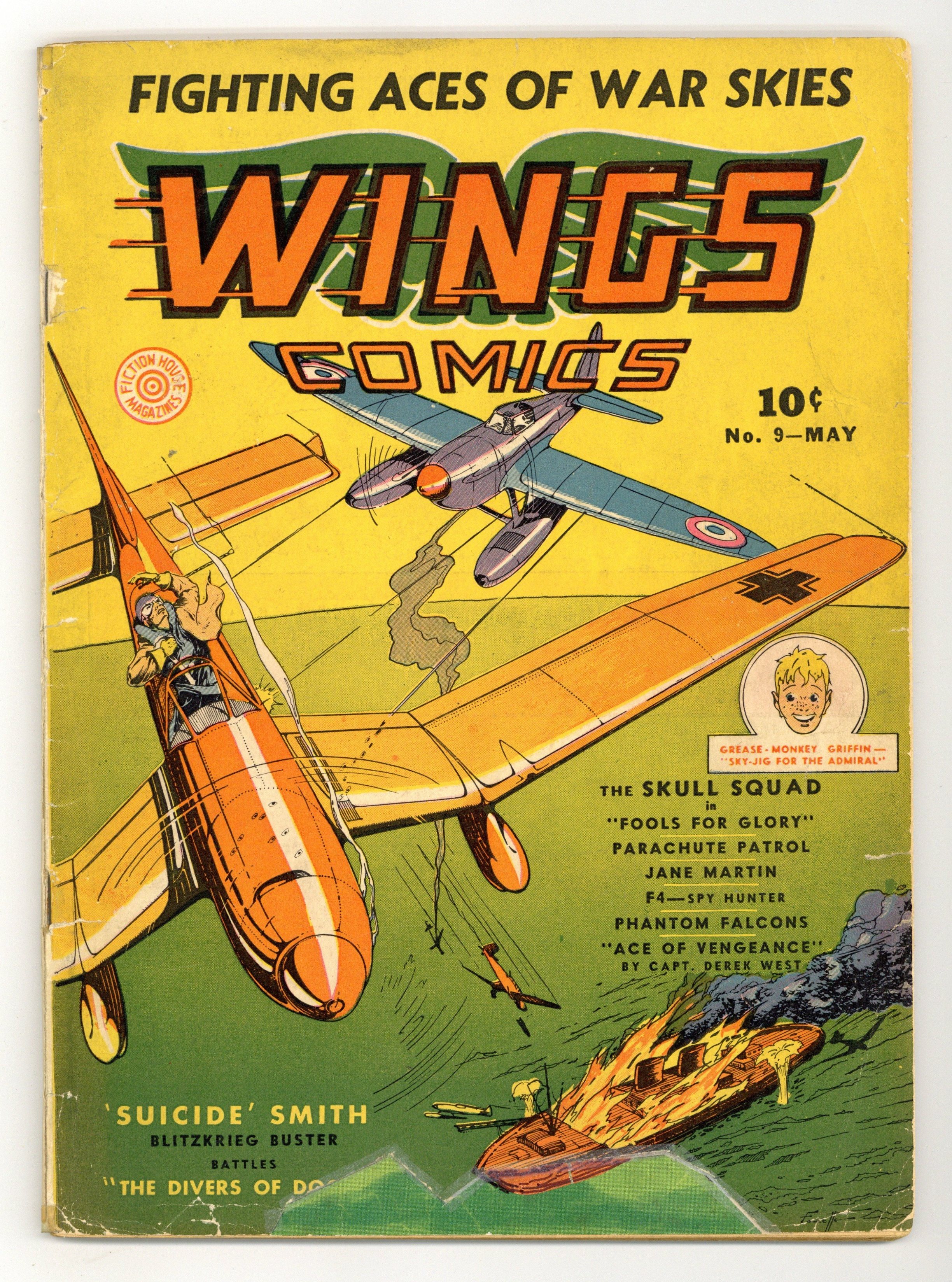 Starts Jan 19 Cover by Gene Fawcette. Edited by Malcolm Reiss and Gene Fawcette. Stories and art by Arthur Peddy, Al Gabriele, Al Walker, John Celardo, Gene Fawcette, Leonard Frank, and Nick Cardy. Aviation-themed adventure, combat and history tales from pioneering comics publisher Fiction House. Clipper Kirk captures a mysterious map from a downed German pilot; Action nurse Jane Martin uses chloroform to escape a hospital that's a front for Nazi drug smugglers; Suicide Smith also faces drug-stealing Nazis, in the Mediterranean. Skull Squad; Parachute Patrol; Jane Martin; Clipper Kirk; F4 of the Air Intelligence; Suicide Smith; The Phantom Falcons; Wing Tips; Flying Colors; Vultures of Vengeance; Greasemonkey Griffin. 64 pages, Full Color. Cover price $0.10.