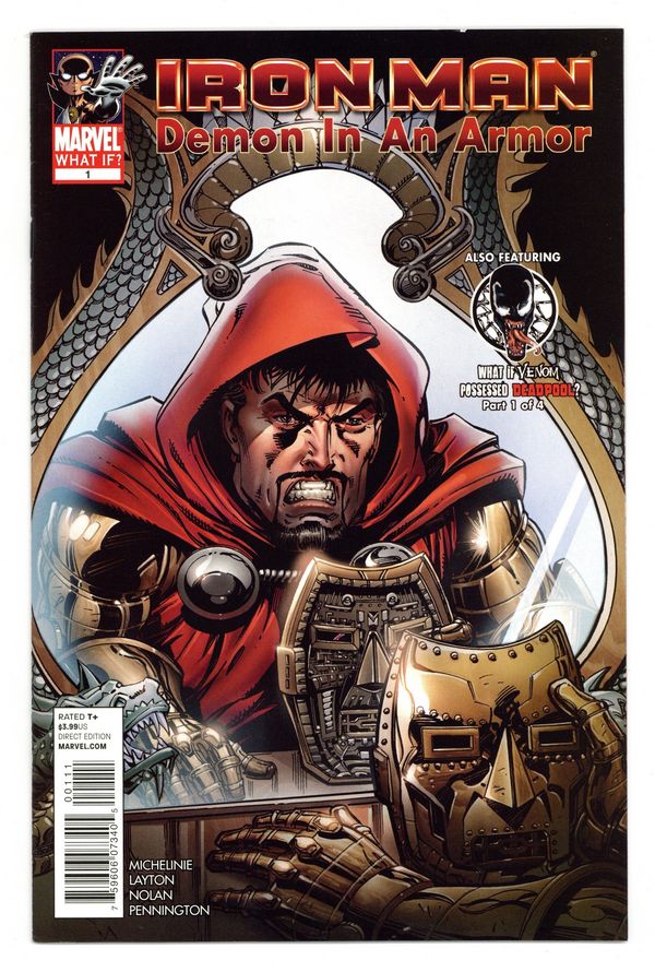 Starts Apr 4 Story by Bob Layton & David MichelinIe Written by DAVID MICHELINIE Penciled by GRAHAM NOLAN Cover by BOB LAYTON Back-Up Story By RICK REMENDER & SHAWN MOLL Would Tony Stark still be Iron Man...if he wasn't Tony Stark? Twenty years ago, in a college experiment gone bad, the young Stark's mind is transferred to the body of impoverished but brilliant fellow student, Victor von Doom! Blamed for the unsanctioned research, his memory wiped clean, Tony is deported and forced to face life as a disgraced Latverian commoner. Meanwhile, von Doom grows and flourishes in the wealth and privilege of being sole heir to Stark Industries. Thus, in separate cauldrons on different sides of the world, both Iron Man and Dr. Doom are forged anew. But who are the men inside the armors...really? Find out in 'WHAT IF TONY STARK HAD BECOME DR. DOOM?', co-plotted and written by David Michelinie ('IRON MAN: THE END'), pencilled by Graham Nolan ('X-MEN FOREVER') and co-plotted and inked by Bob Layton ('HERCULES: TWILIGHT OF A GOD'). PLUS, What If: The Venom Symbiote Possessed Deadpool - Part 3! 40 PGS./Rated T+ Cover price $3.99.