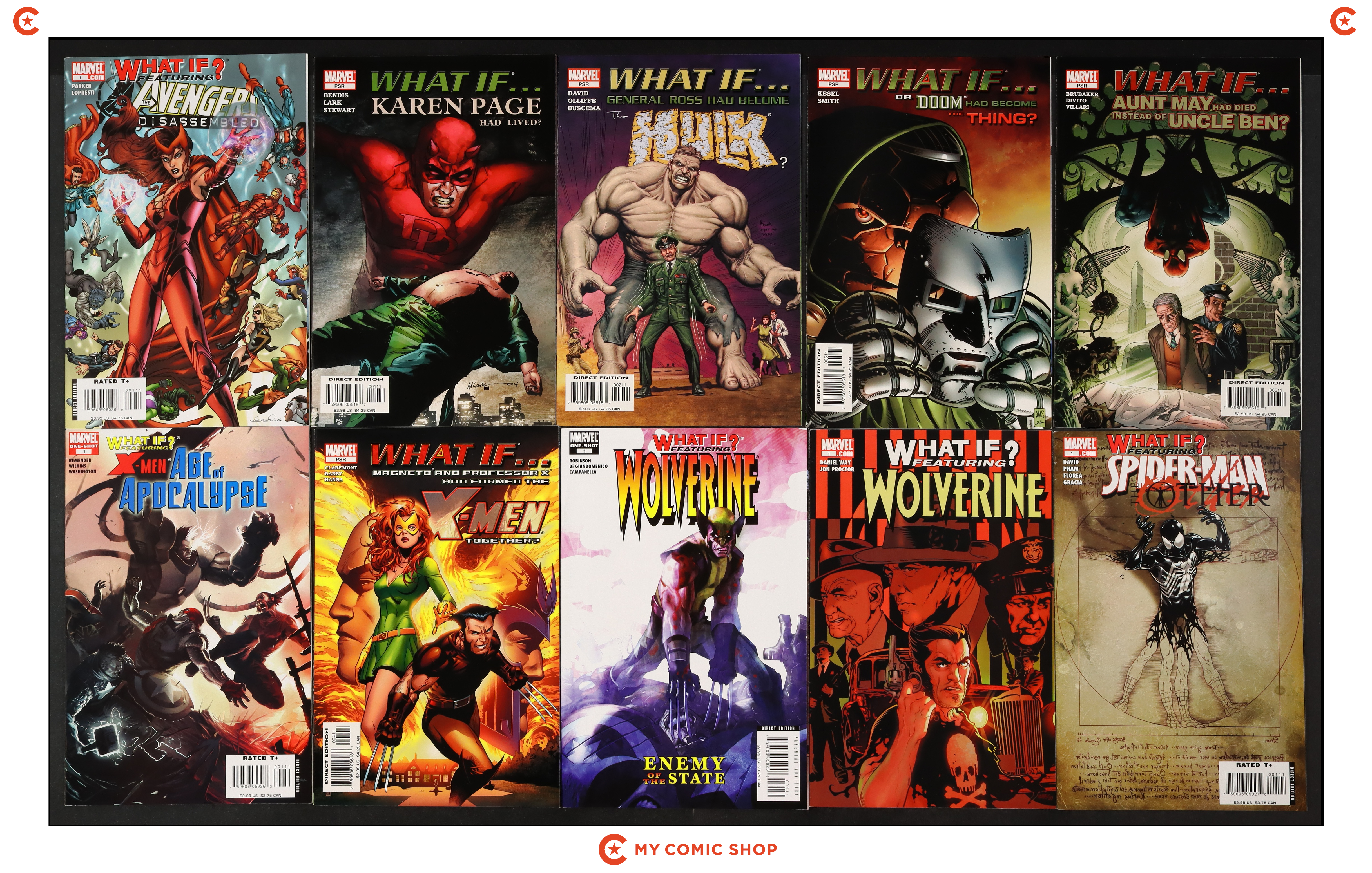Issues 1 of What If Aunt May Had Died Instead of Uncle Ben (2005); 1 of What If Dr. Doom Had Become the Thing (2005); 1 of What If General Ross Had Become The Hulk (2005); 1 of What If Karen Page Had Lived (2005); 1 of What If Avengers Disassembled (2007); 1 of What If Spider-Man The Other (2006); 1 of What If Wolverine (2005); 1 of What If Wolverine Enemy of the State (2007 Marvel); 1 of What If Magneto Had Formed the X-Men with Professor X (2005); and 1 of What If X-Men Age of Apocalypse (2006). Most will grade in the VF range with some grading FN.