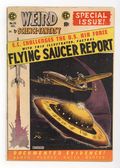 Cover by Al Feldstein. Stories by Al Feldstein. Art by Wally Wood, Reed Crandall, George Evans, and Joe Orlando. EC's influential sci-fi comic was a reflection of its times. And none more so than this issue, devoted to the real-life flying saucer craze in 1950s America, and based on the book The Flying Saucers Are Real, by Major Donald Keyhoe, also the inspiration for the 1957 sci-fi classic Earth vs. the Flying Saucers. One article features the distinctive art of Wally Wood, portraying an atomic explosion on Mars, plus the observation that Flying Saucer sightings had a dramatic upswing after the US atomic bomb tests. Other articles are profusely illustrated retellings of real-life flying-saucer sightings and alien abduction claims. Was This "Fairly Heavy Body" a Flying Saucer?; The Eastern Airlines Case; The Gorman-Fargo, N.D., Case; The Mantell-Godman Case; The Muroc Air Force Base Case; The United Air Lines Emmett, Idaho Case; Was This The Answer?; The Dec. 27, 1949 Release; 1950 Sightings; 1951 Sightings; 1952 Sightings; The Utah Pictures; The Indianapolis Case; The Nash-Fortenberry Case; The River Edge, N.J. Case; Saucers Over Washington, D.C.; Recent Developments. 32 pages, Full Color. Cover price $0.10.