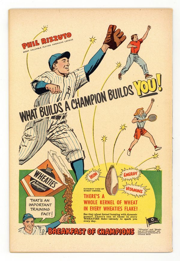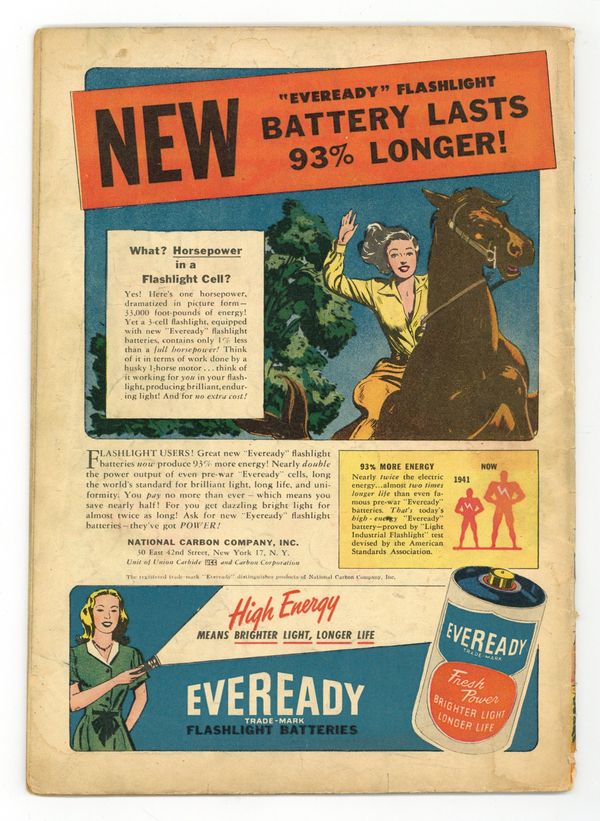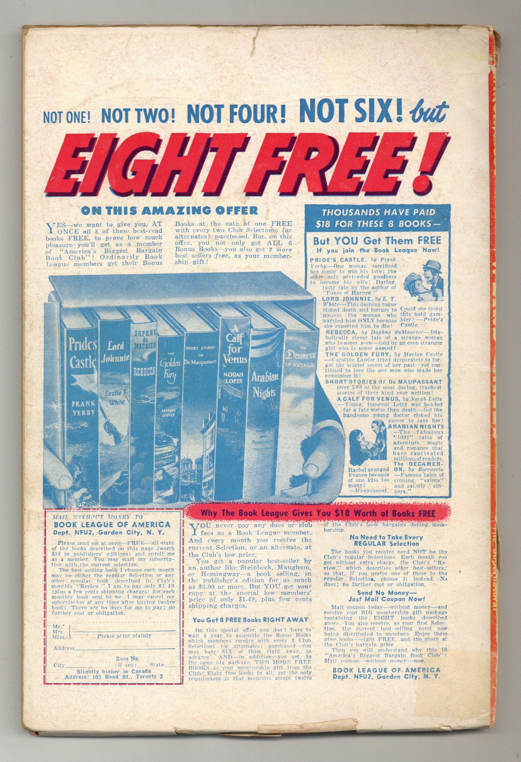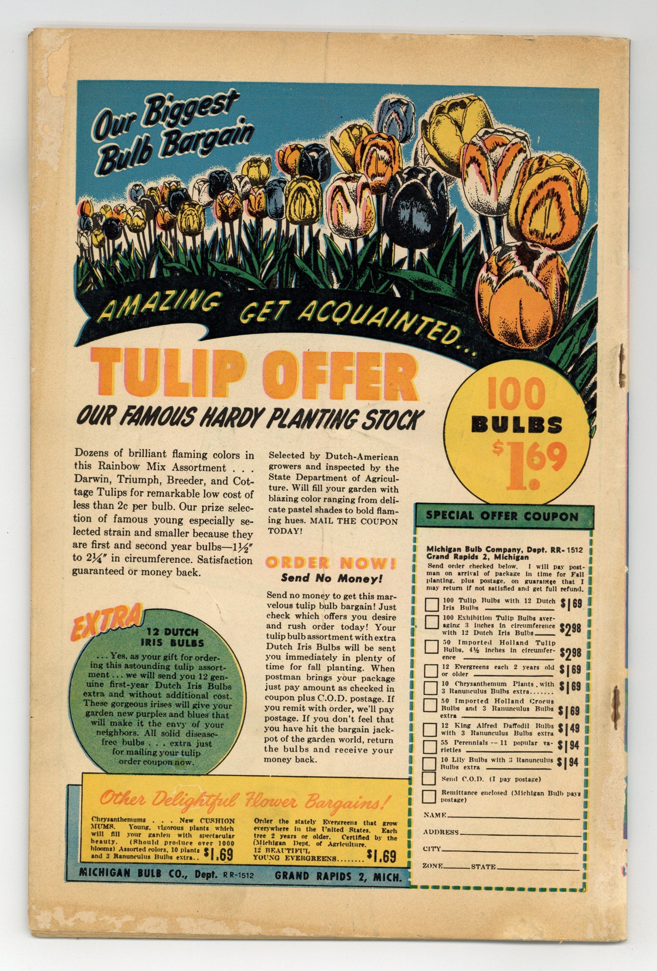 Cover by Harry G. Peter. "The Secret of the Limestone Caves," script by Joye Hummel (as Charles Moulton), art by Harry G. Peter; Olive, an Amazon trainee, learns to temper her Amazon strength with loving kindness after viewing Princess Diana in action against the Radium Giants. Wonder Women of History: three-page Lynde Dix bio, art by Paul Reinman. "The Song of the Sirens," script by Robert Kanigher, art by Harry G. Peter; The jealousy of Steve's old girlfriend turns deadly when she acquires an armlet that gives her an irresistible power over men. "A Human Bomb," art by Harry G. Peter; Wonder Woman helps a female candidate for prison warden transform a women's prison into a model facility using Amazon methods of rehabilitation, all while fighting off the sabotage attempts of her competitor. Wonder Women of History: three-page Nellie Bly bio, art by Paul Reinman. Two-page text story, "Race to the Top of the World" by Charles King. One-page Tootsie Roll ad, "Captain Tootsie Traps the Circus Culprit" (art by C.C. Beck). 52 Pages, Full Color. Cover price $0.10.
