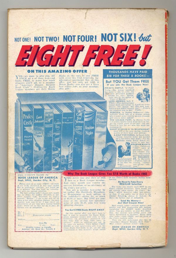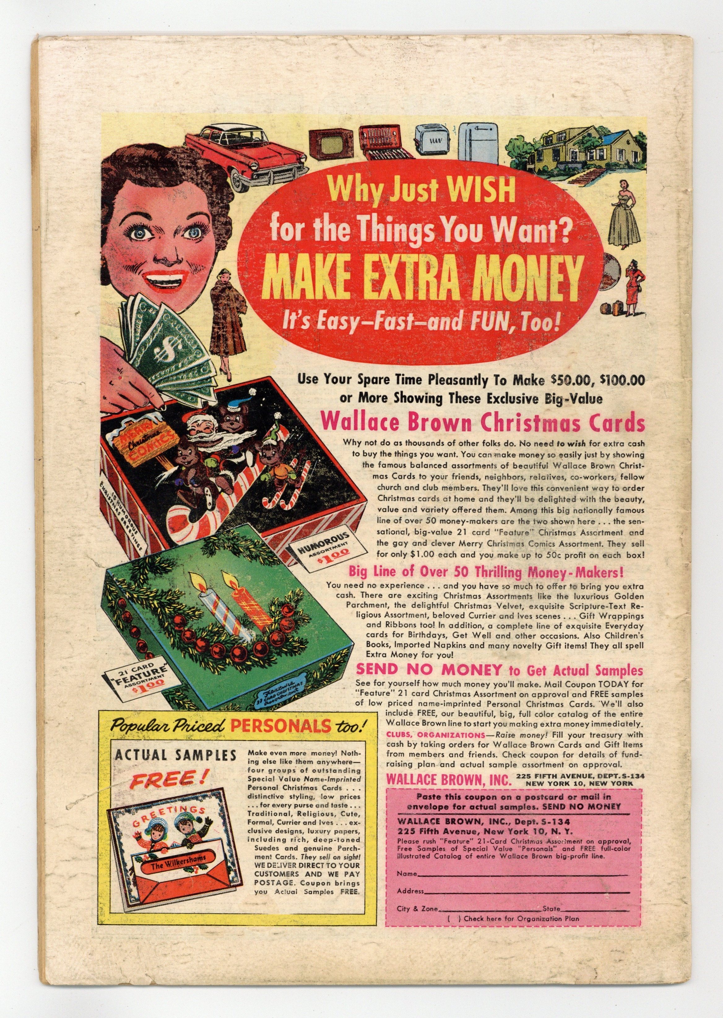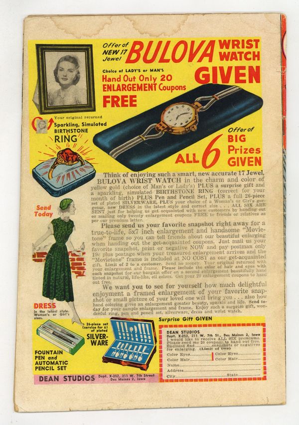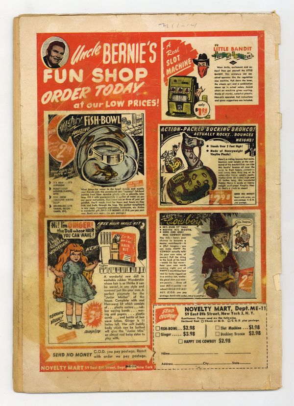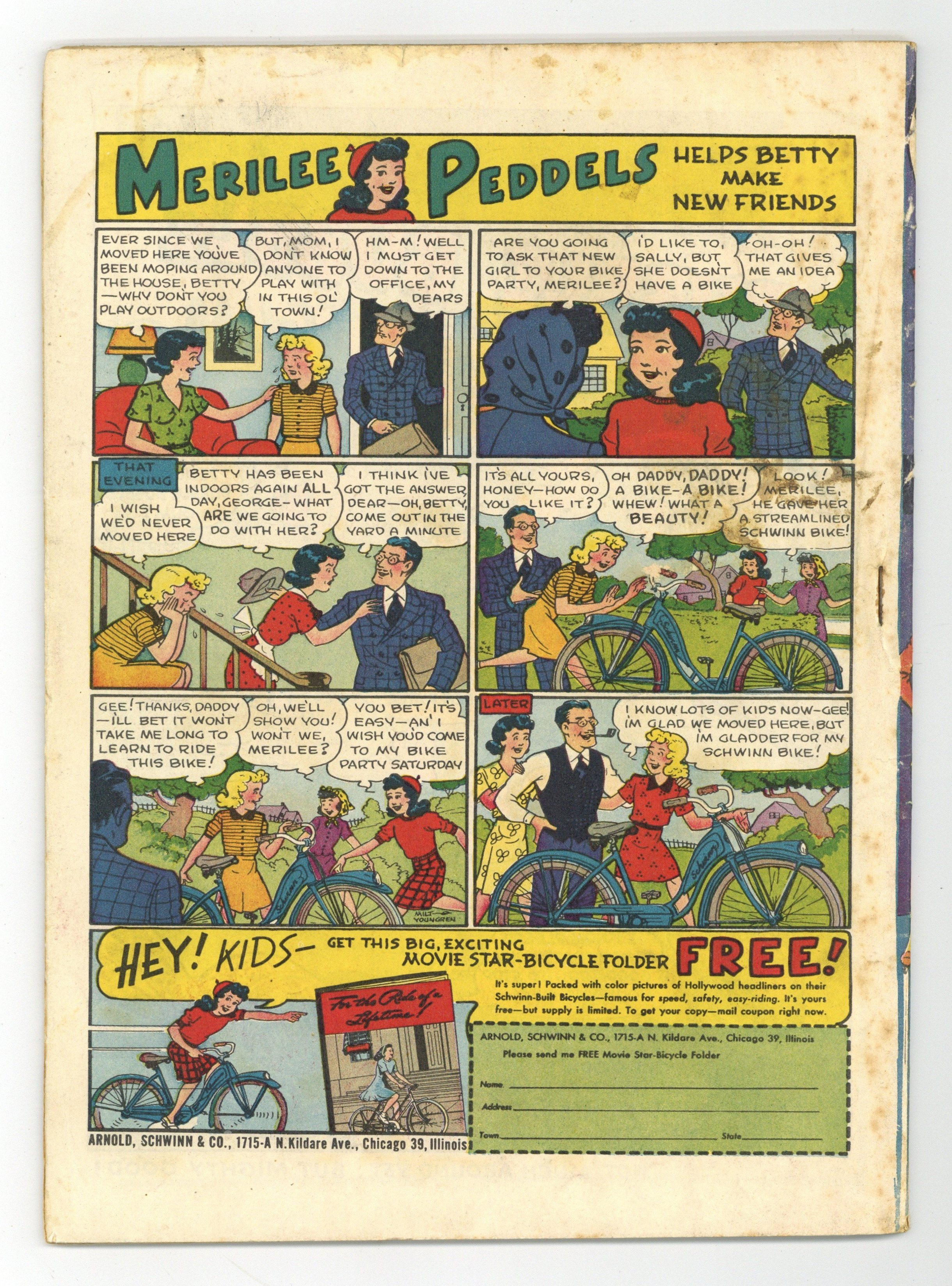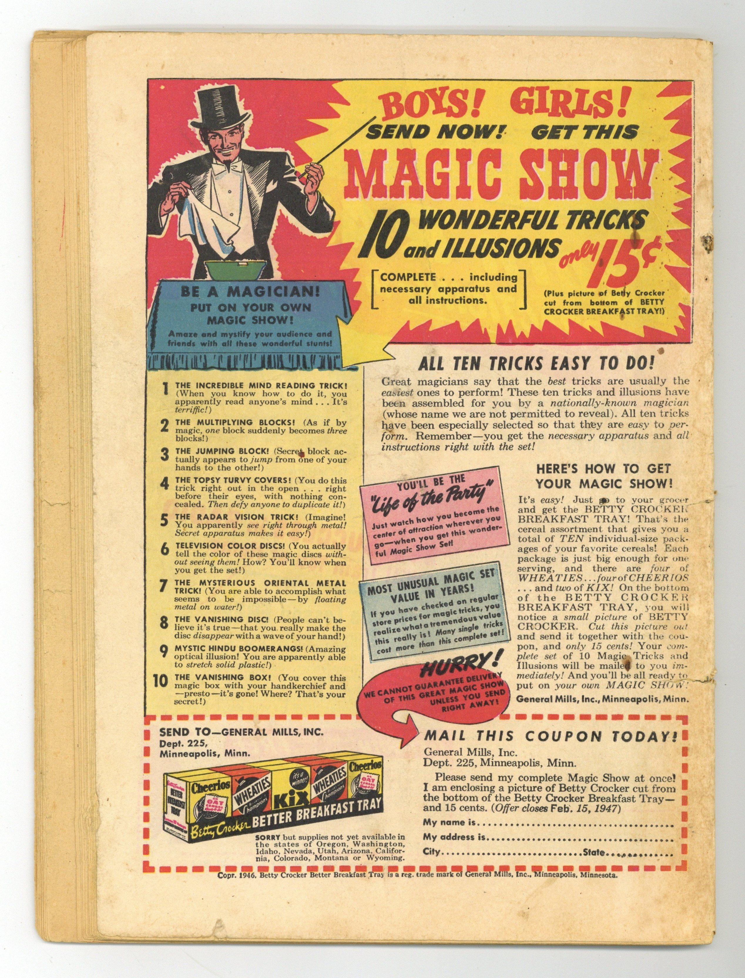 Cover by Walt Kelly. Stories and art by Carl Barks, Floyd Gottfredson, Merrill De Maris, Bob Karp, Karl Karpe, Ralph Heimdahl, Paul Murry, Chase Craig, Gil Turner, Don Gunn, George Waiss, Bill Wright, Sylvia Holland, and Al Taliaferro. Sometimes listed as Vol. 7 #10. The long-running vehicle for Disney character comics featured work by Carl Barks, Floyd Gottfredson, and Pogo's Walt Kelly. In a classic story from the Mickey Mouse comic strip, Mickey matches wits with a mesmerist who uses his act for jewel theft. In a story by Barks, Donald is jealous of his nephews' card tricks, so he puts together a magic act of his own in an attempt to impress Daisy. A comics adaptation of Bongo, one of the segments in the Disney film Fun and Fancy Free. Donald Duck; Bucky Bug; Li'l Bad Wolf; Mickey Mouse; Bongo; For Rent Apply to Donald Duck; Bootle Beetle; Pluto's Lesson; Mickey Mouse: The Jewel Robbery. 48 pages, Full Color. Cover price $0.10.