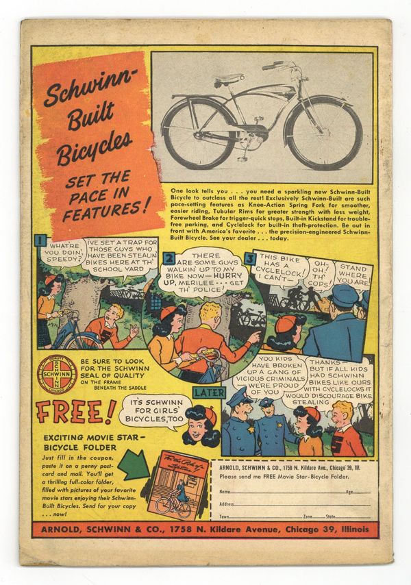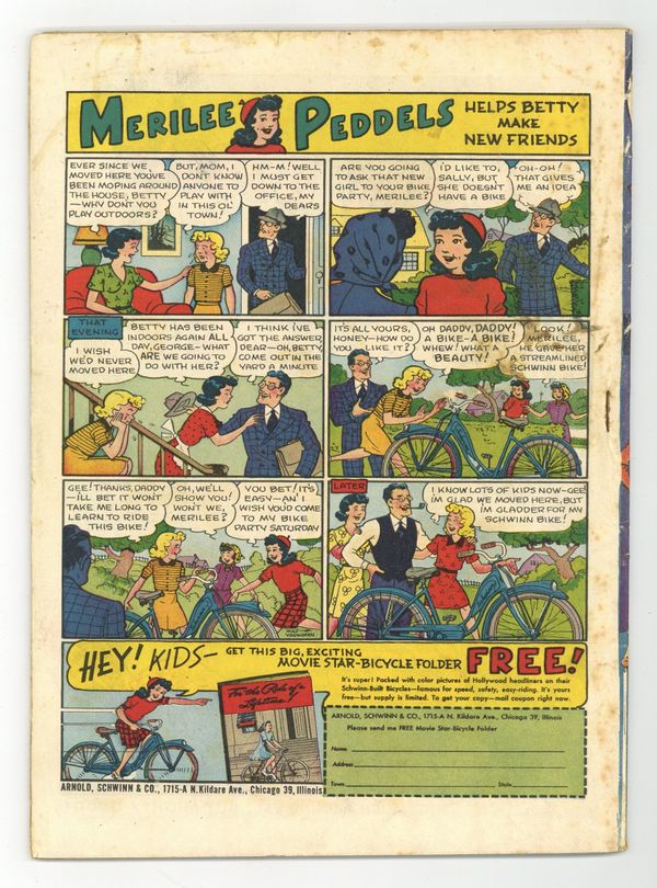 Cover by C. C. Beck. Stories and art by Basil Wolverton, Bernie Krigstein, Gus Ricca and Bill Woolfolk. The Fawcett comic that introduced the original Captain Marvel (Shazam) to the world. A stolen golden arrow is enough to frame Golden Arrow for murder, in a story with early art by EC legend Bernie Krigstein. When crooks try to swindle a fishing fleet with phony documents, Captain Marvel's hands are tied - so young Leopold becomes Red Cloak, the boy pirate. Plus a "Culture Corner" strip by legendary cartoonist Basil Wolverton, featuring useless but hilarious advice on "How to Put a Wave in Your Hair." And "Comix Cards" (like the later Marvel Value Stamps) featuring two popular characters, Hopalong Cassidy and Nyoka the Jungle Girl. Captain Marvel and the Boy Pirate!; Witless Witmore: Book-Minded; Whipper-Snappers; Golden Arrow and the Secret of the Golden Arrow; Wickys Bubble Trouble; Turn About; Ibis the Invincible and the King of Darkness; Wilbur the Waiter; The Culture Corner: How to Put a Wave in Your Hair. 32 pages, Full Color. Cover price $0.10.