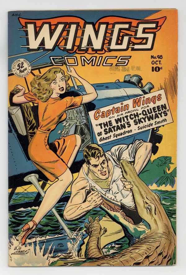 Cover by Bob Lubbers. Edited by J.F. Byrne and William R. Shelton. Stories and art by Bob Lubbers, Art Saaf, Charles Sultan, George Evans, John Celardo and Maurice Whitman. Aviation-themed adventure, combat and history tales from pioneering comics publisher Fiction House. Reporter Jane Martin seeks a vanished European politician in the snowy mountains; Suicide Smith tries to calm enraged South American natives after dam workers steal an idol; A mysterious bird-spirit seems to drive a shell-shocked veteran to murder. Captain Wings; Jane Martin; The Flying Furies; Air Heroes of World War II; Phantom Falcon; Suicide Smith; Ghost Squadron. 52 pages, Full Color. Cover price $0.10.