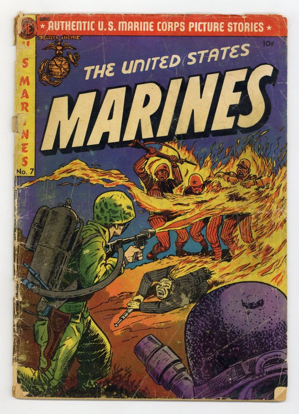 Published by Magazine Enterprises. Cover by Dick Ayers and Ernie Bache. Edited by Raymond C. Krank. Stories and art by Bob Powell and others. Sometimes listed as A1 Comics (1944 Life's Romances) #68. Action-packed fact and fiction about the US Marine Corps, in a series revived for the Korean War. A pilot flies night raids over Korea; The story of the battle of Tripoli, remembered in song in the Marines' Hymn; Profiles of the U.S.M.C. Hall of Fame. The Man in the Flying Nightmare; Marine Boot Camp; The Shores of Tripoli!; "Look After My Billy!"; Mister Marine Corps; The Spirit of Semper Fi! 36 pages, Full Color. Cover price $0.10.