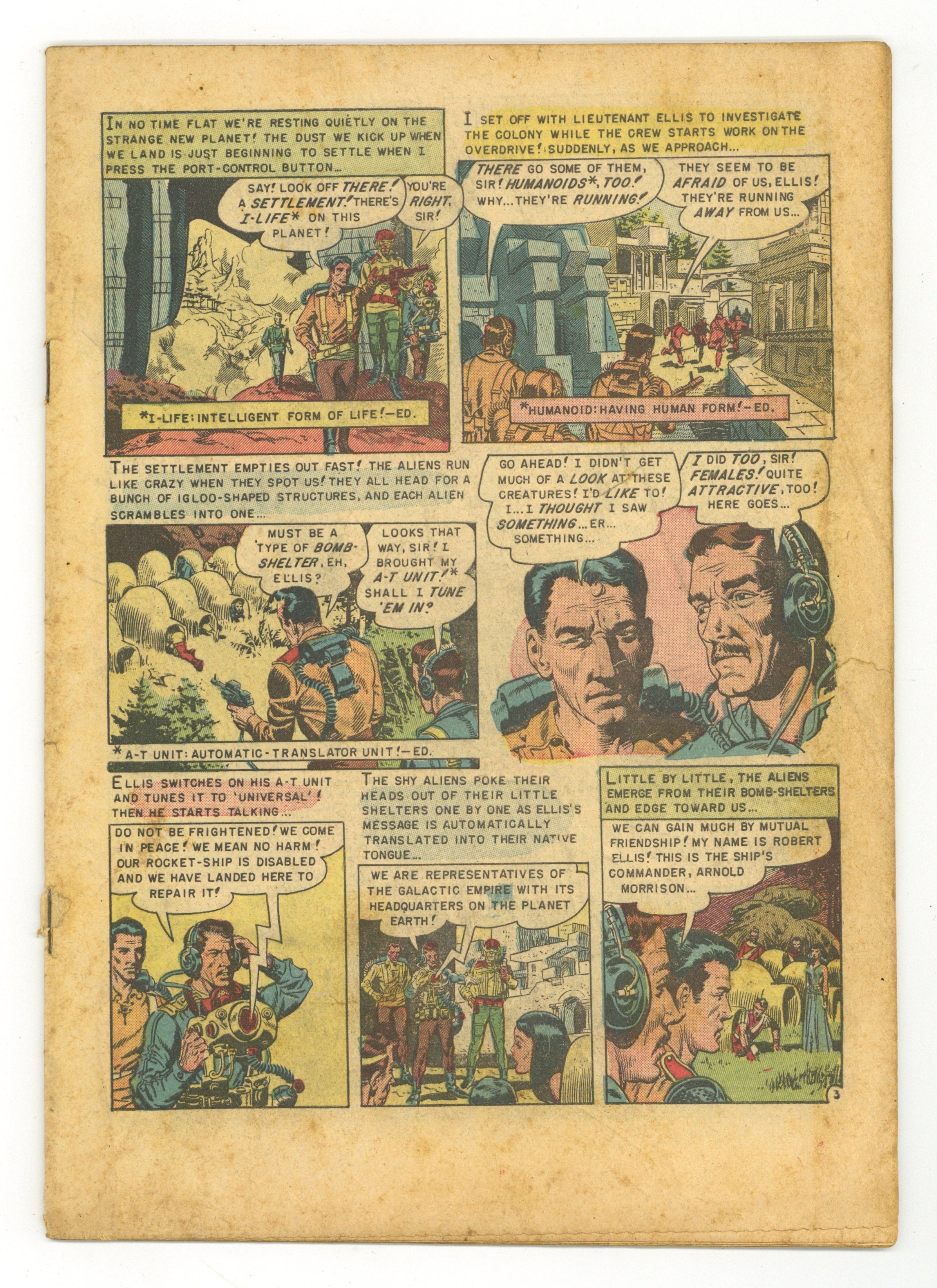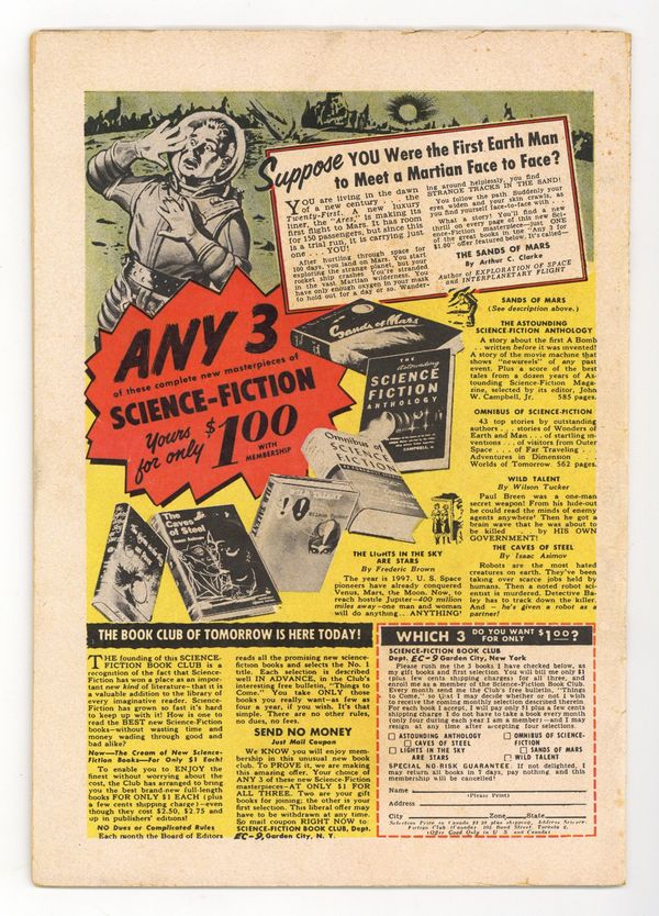 Cover art by Joe Orlando. Al Williamson is profiled on inside front cover (includes a photo of the artist). "King of the Grey Spaces!" script by Ray Bradbury (original) and Al Feldstein (adaptation), pencils by John Severin, inks by Bill Elder; A group of boys watch the launching of a rocket ship, and two of them wish that they were older and could make the trip themselves; They apply for the Interplanetary Patrol and await their decision once they turn 21, but soon Chris gets a surprise that will change his life forever; adaptation of "R Is For Rocket" by Ray Bradbury. "Hot-Rod!", script by Bill Gaines (co-plot) and Al Feldstein (co-plot and script), art by Jack Kamen; Amos and Sally are driving by a lake when a strangely garbed man jumps up on the running board of their car and drops a package in the back seat; Later, Amos looks at the package, postmarked May 15, 2053, and discovers something called a trans-dimensional transporter inside; Thinking it to be some sort of gadget to soup up his hot-rod, Amos installs the device, traveling into the future. "Cleanser" text story. "Brain-Child!", script by Al Feldstein, pencils by Al Williamson, inks by Al Williamson and Roy Krenkel; Colonel Dane is selected to pilot a brand-new spaceship, powered by an electronic brain, which enables this vessel to be a virtual one-man war rocket; While it seems the rocketship could operate itself with no human pilot, the drawback is the ship is void of emotion: it cannot hate, it doesn't know love and it cannot create. "Time For a Change!", script by Al Feldstein, art by Joe Orlando. 36 pgs., full color. Cover price $0.10.
