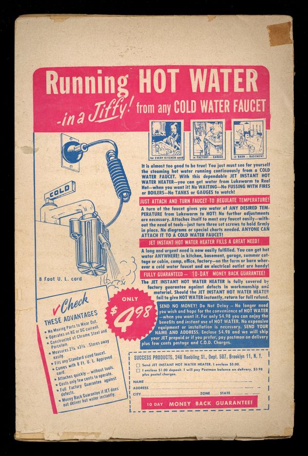 Cover by C. C. Beck. Stories and art by Basil Wolverton, Otto Binder, Bernie Krigstein, Howard Boughner, Ken Bald, Gus Ricca and Bill Woolfolk. The Fawcett comic that introduced the original Captain Marvel (Shazam) to the world. Golden Arrow dresses as William Tell for a Mardi Gras party, but doesn't know why someone would want to steal his apple, in a story with early art by EC legend Bernie Krigstein. When Taia's soul is captured by the witches of Bald Mountain, only Ibis and his Ibistick can save her. Plus a "Culture Corner" strip by legendary cartoonist Basil Wolverton, featuring useless but hilarious advice on "How to Go Soak Your Head." Captain Marvel and the Junkman Mystery!; Whitey Whiskers and Daniel Boone Jr.; Golden Arrow and the Mardi Gras; Whipper-Snappers; Whiz Quiz; Wilbur the Waiter; The Spot; The Culture Corner; Ibis the Invincible: The Witches' Sabbath; Doc Sorebones; Ezra of the Ozarks; Figure Frets; Mickey the Monitor: Master Strategist; Crime Smasher: Peak of His Career. 48 pages, Full Color. Cover price $0.10.