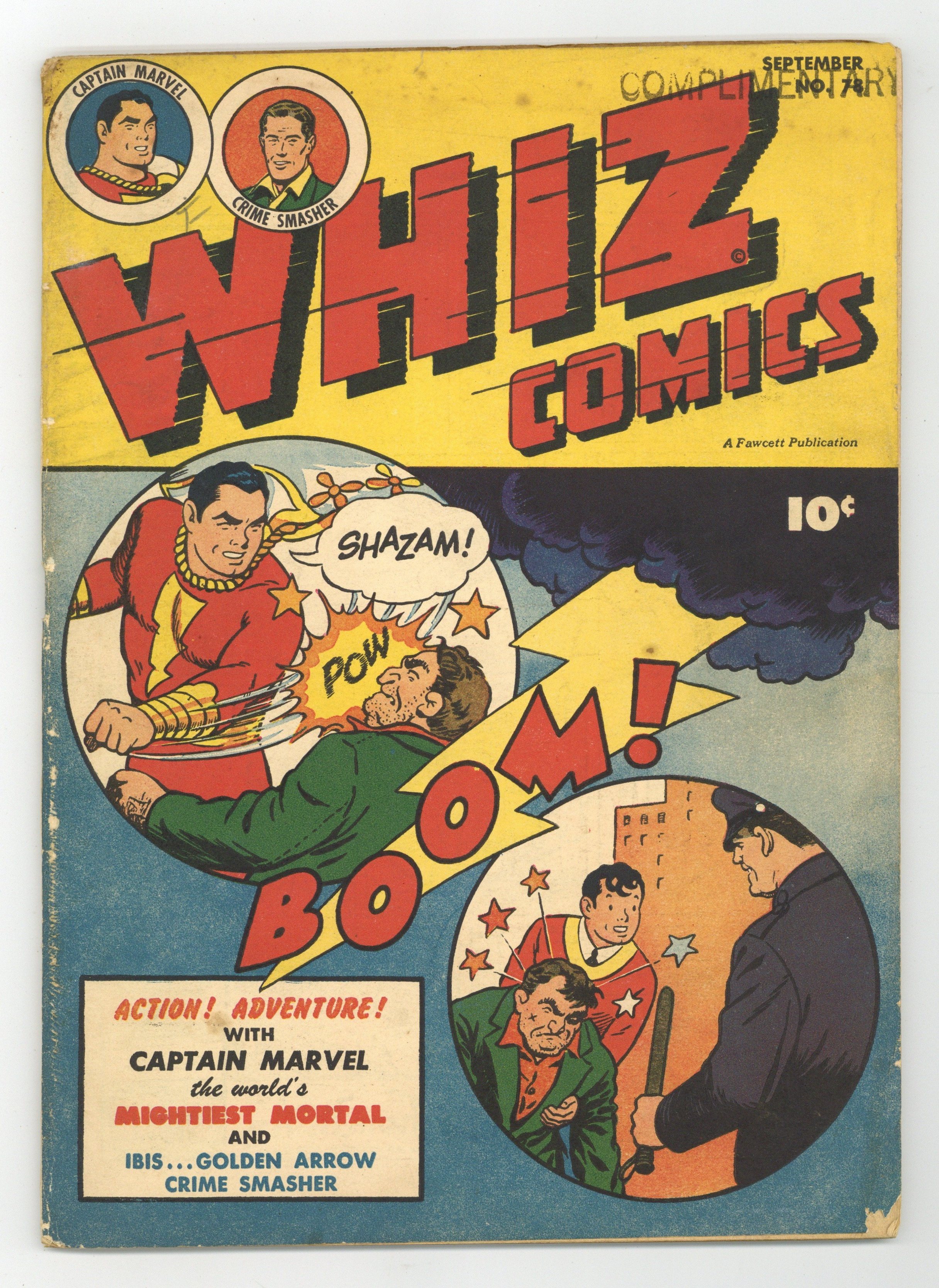 Cover by C. C. Beck. Stories and art by Basil Wolverton, Otto Binder, Bernie Krigstein, Howard Boughner, Ken Bald, Kurt Schaffenberger and Bill Woolfolk. The Fawcett comic that introduced the original Captain Marvel (Shazam) to the world. Golden Arrow must figure out which of three prospectors is robbing the other two, in a story with early art by EC legend Bernie Krigstein. Whitey Whiskers tries to teach Daniel Boone Jr. how to ride a horse. Plus a "Culture Corner" strip by legendary cartoonist Basil Wolverton, featuring useless but hilarious advice on "How to Mat Your Hair Down Flat." Captain Marvel, Bodyguard; Whitey Whiskers and Daniel Boone Jr.; Golden Arrow: The Inside Job; Whipper-Snappers; Whiz Quiz; Wilbur the Waiter; A Blank Sheet; The Culture Corner; Ibis the Invincible: The Terror Typewriter; Doc Sorebones; Ezra of the Ozarks; Figure Frets; Mickey the Monitor Packs a Wallop; Crime Smasher: The Substitute for Trouble. 48 pages, Full Color. Cover price $0.10.