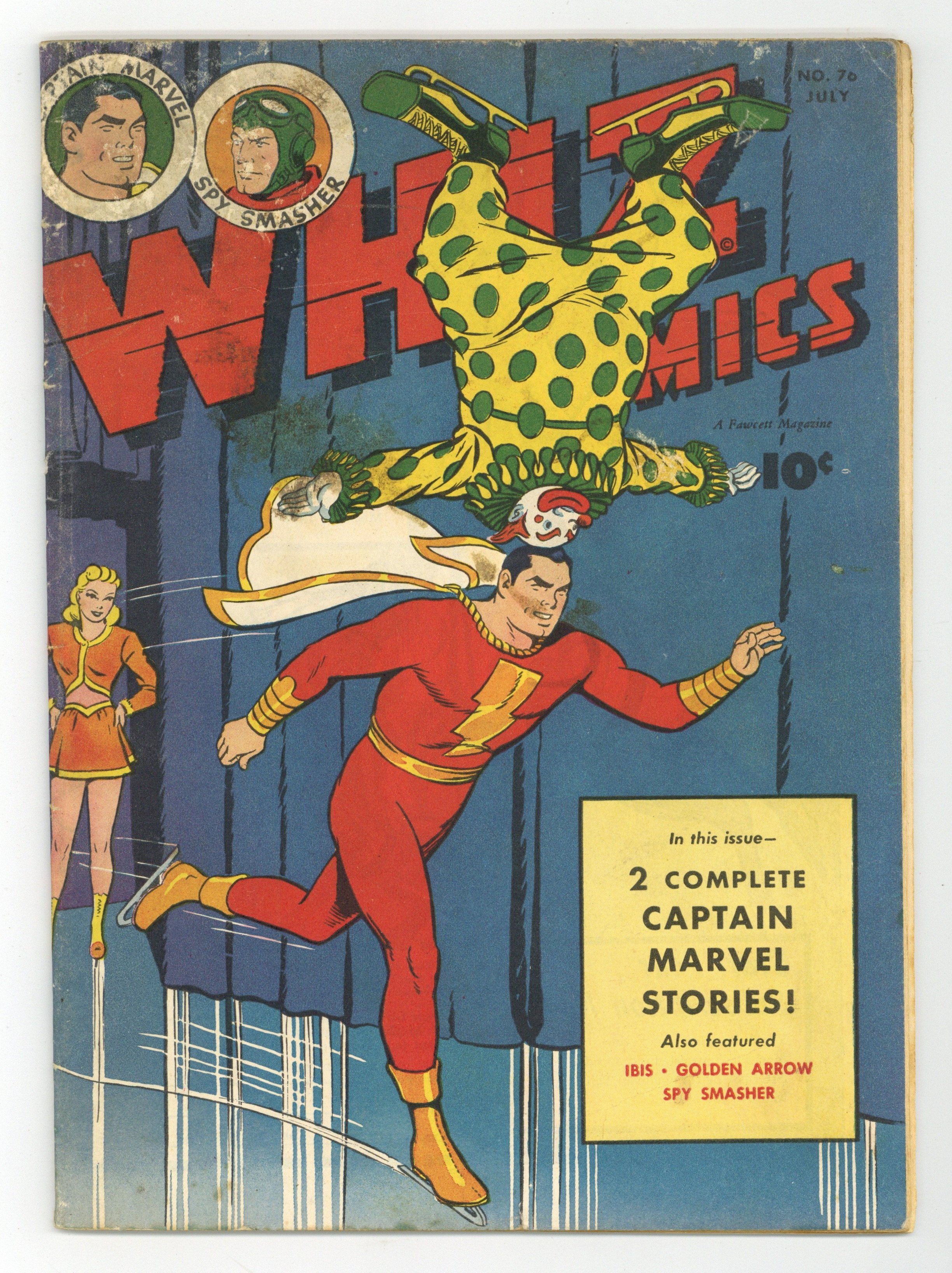 Cover by C. C. Beck. Stories and art by Basil Wolverton, Otto Binder, George Tuska and Al Carreno. The Fawcett comic that introduced the original Captain Marvel (Shazam) to the world. With WWII over, Alan Armstrong is ready to retire his famous Spy Smasher identity. But when crooks steal the plans for his Gyro-Sub, he assumes a new alter ego for peacetime: Crime Smasher. Captain Marvel finds himself part of an ice-skating show after Billy Batson gets in over his head. Plus a "Culture Corner" strip by legendary cartoonist Basil Wolverton, featuring useless but hilarious advice on "How to Contemplate the Back of Your Pate." Captain Marvel: The Ice Follies; Golden Arrow: The Psychological Angle; Whipper-Snappers; Wilbur the Waiter; Spy Smasher: Introduces Crime Smasher; Bank Robbery; The Culture Corner; Ibis the Invincible: The Flying Dutchman; Doc Sorebones; Mickey the Monitor Supplies the Evidence; Captain Marvel: The Subway Gold Rush. 48 pages, Full Color. Cover price $0.10.
