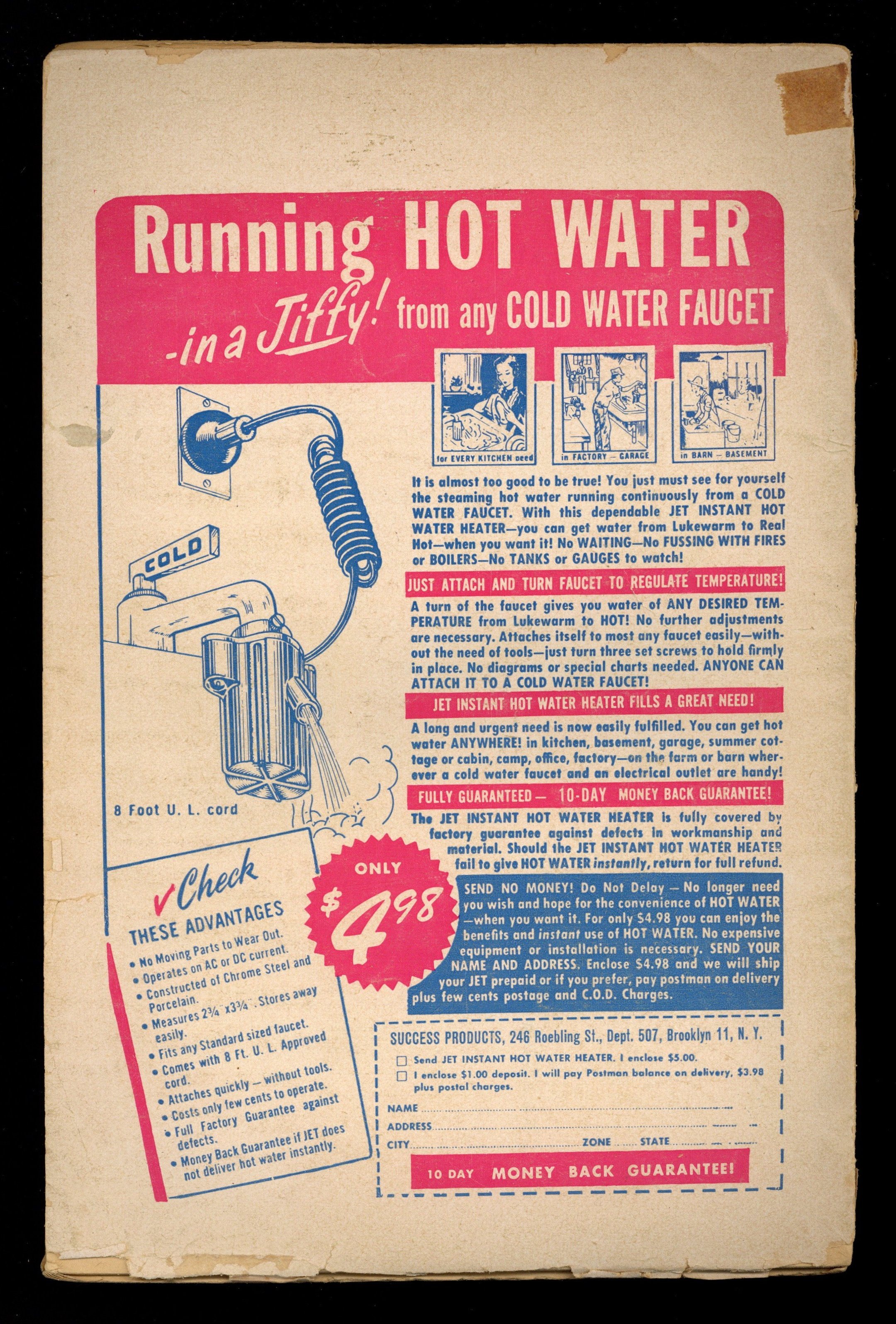 Cover by Lee Elias. Stories and art by Bob Powell, Vic Donahue, Warren Kremer, Joe Certa, and Manny Stallman. A showcase for Harvey's distinctive brand of pre-Code horror. A scientist's electrical experiments create an evil energy being. Another scientist creates a one-celled organism that grows out of control. The ghost of a murdered tailor animates empty clothing to seek revenge on his killer. It!; The Flash of Doom; Witches Tricks; The Room; The Mask of Murder; Keepers of Horror; The Flaming Horror; Cloth of Terror; The Howl of Death! 32 pages, Full Color. Cover price $0.10.