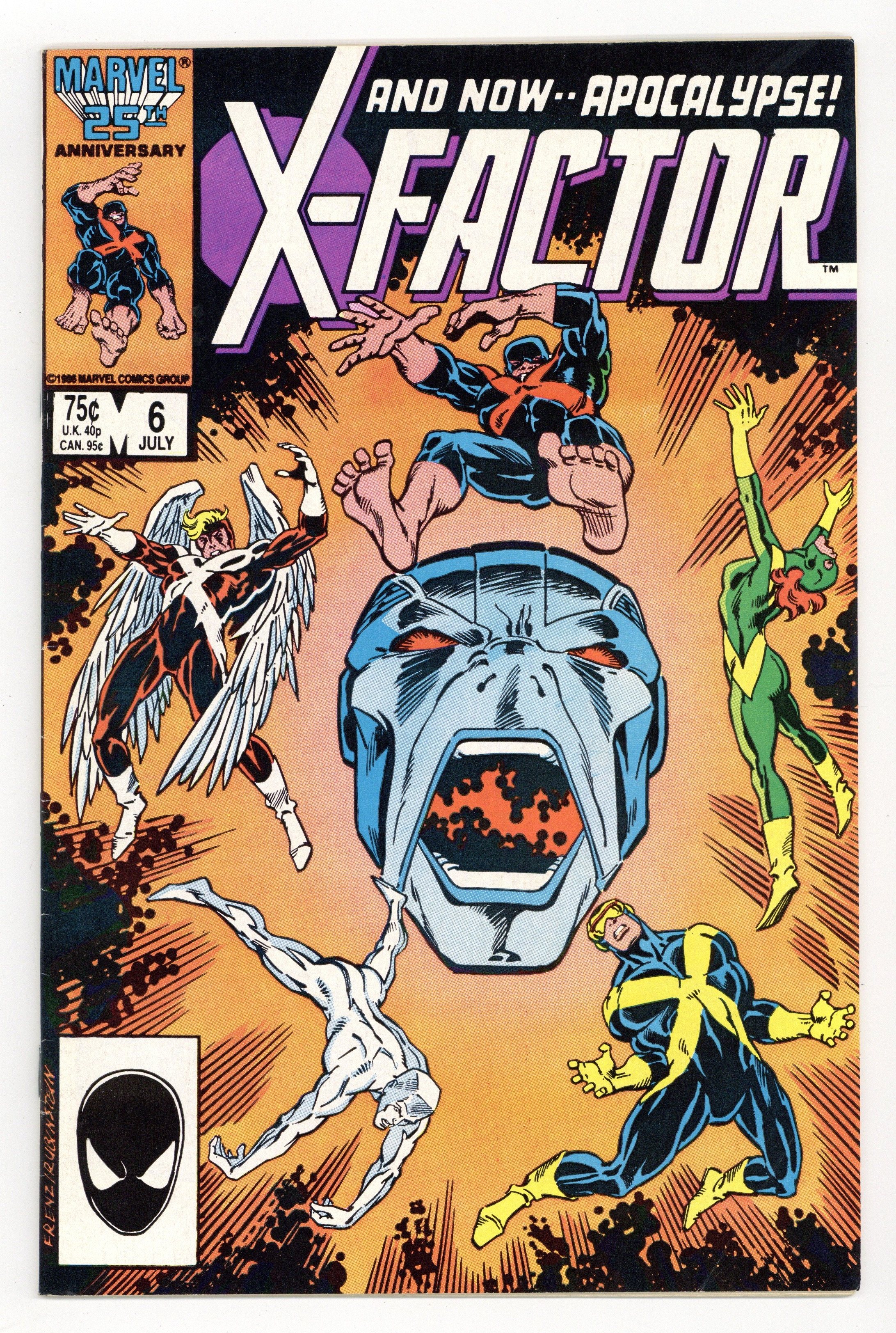 Starts Dec 22 Newsstand Edition. "Apocalypse Now!" Part 2 of 2. 1st full appearance of Apocalypse. Story by Louise Simonson. Art by Jackson Guice and Bob McLeod. Cover by Ron Frenz and Joe Rubinstein. Cyclops begins to worry that the group's X-Factor ads are fueling mutant paranoia among humans. Plus, the last time X-Factor fought the Alliance of Evil they were soundly defeated. Can they take down their adversaries in time to save the life of a fellow mutant, before it's too late? And, witness the fury and power of Apocalypse, a mutant tyrant who believes in a world where only the strong survive. Cover price $0.75.