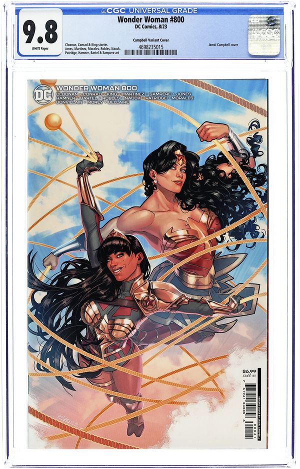 Starts May 4 1st appearance of Trinity, Wonder Woman's daughter. Final issue. Cover by Jamal Campbell. Written by Becky Cloonan, Michael W. Conrad and Tom King. Art by Joëlle Jones, Alitha Martinez, Nick Robles, Todd Nauck, Skylar Patridge, Cully Hamner, Jen Bartel, Daniel Sampere and Mark Morales. Landmark 800th issue! The two-part "Whatever Happened to the Warrior of Truth?" concludes! Diana's visions become more vivid as she finds herself trapped in the dreams of those around her! As she struggles to escape, her life as Wonder Woman hangs in the balance. When the dust settles, will she still be the Amazons' greatest champion? Find out in this extra-special celebration by Becky Cloonan, Michael W. Conrad, Joëlle Jones, Alitha Martinez, Nick Robles, Todd Nauck, Skylar Patridge, Cully Hamner, Jen Bartel and Mark Morales. Characters in this story: Wonder Woman [Diana of Themyscira]; Wonder Girl [Yara Flor]; Bia; Megala; Penelope; Donna Troy; Wonder Girl [Cassandra Sandsmark]; Darkseid; Artemis; Batman [Bruce Wayne]; Thomas Wayne (deceased); Martha Wayne (deceased); Superman [Clark Kent; Kal-El]; Hippolyta; Nubia; Steve Trevor; Siegfried; Etta Candy; Philippus; unnamed Amazons. Plus: Wonder Woman's daughter, Trinity, is introduced in the back-up story "Trinity" by Tom King and Daniel Sampere. Characters in this story: Trinity [Elizabeth Marston Prince; Lizzie] (introduction); Superman [Jon Kent]; Batman [Damian Wayne]; Diana of Themyscira; Nike; unnamed king. For Wonder Woman's continuing adventures, see Wonder Woman (2023 6th Series) #1. 48 pages, full color. Ages 13+ Cover price $6.99.