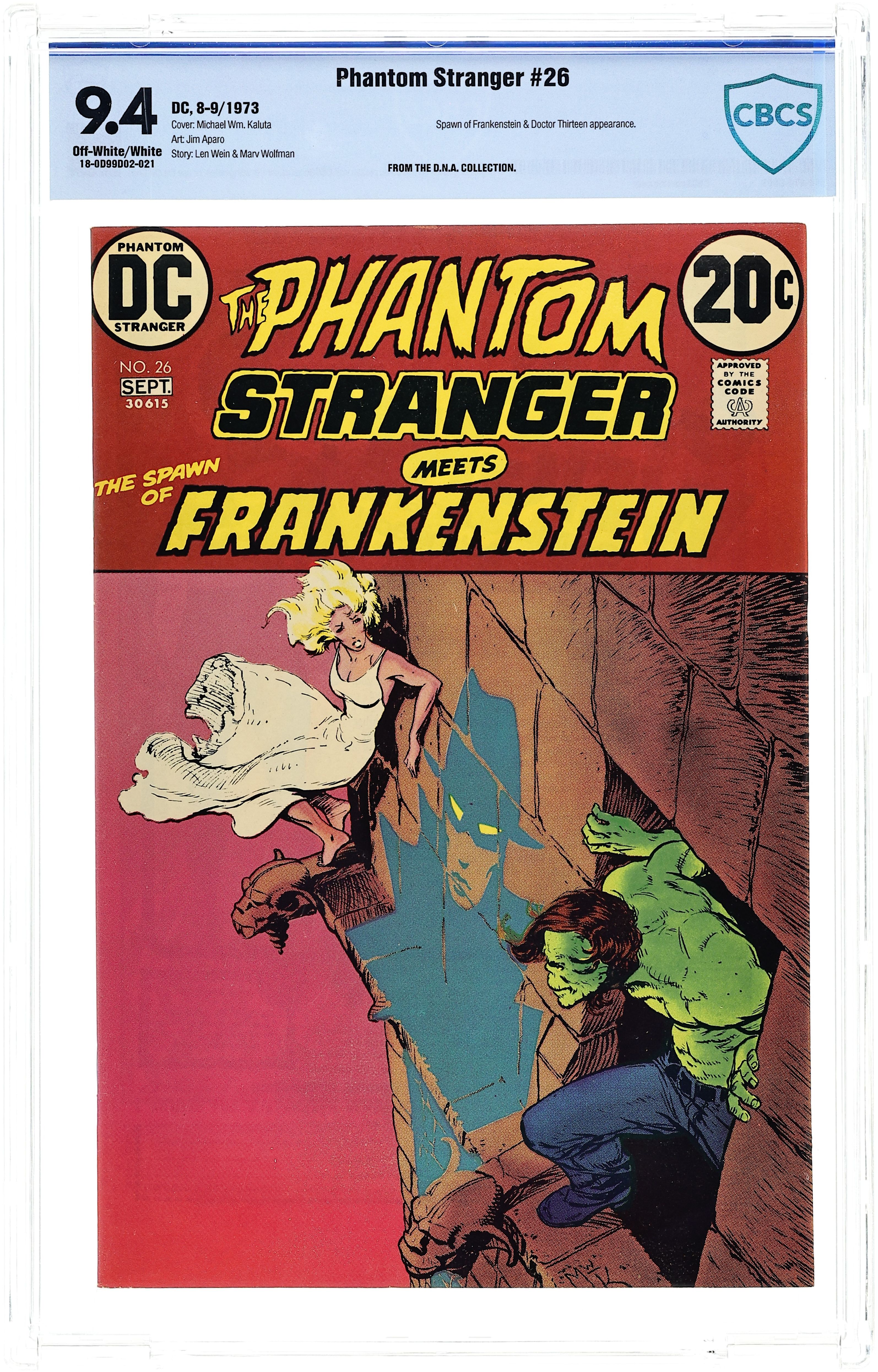 Starts Feb 9 Cover art by Mike Kaluta. "From Dust Thou Art...," script by Len Wein and Marv Wolfman, art by Jim Aparo; Leaving the flaming home of a Satanist, the Spawn of Frankenstein (carrying the body of Rachel Adams) is possessed by two demons who have appeared on this world as a result of the Satanist's spell; Meanwhile, Terrence Thirteen is visiting his unconscious wife in the hospital; He is visited by the Phantom Stranger, to warn Thirteen of coming danger; Just then the Spawn of Frankenstein bursts into the hospital to steal Victor Adam's laser device, and also kidnap Marie Thirteen's body. Half-page text feature, "Behind the Scenes at DC: The Story Behind Strange Sports Stories." 36 pgs., full color. Cover price $0.20.