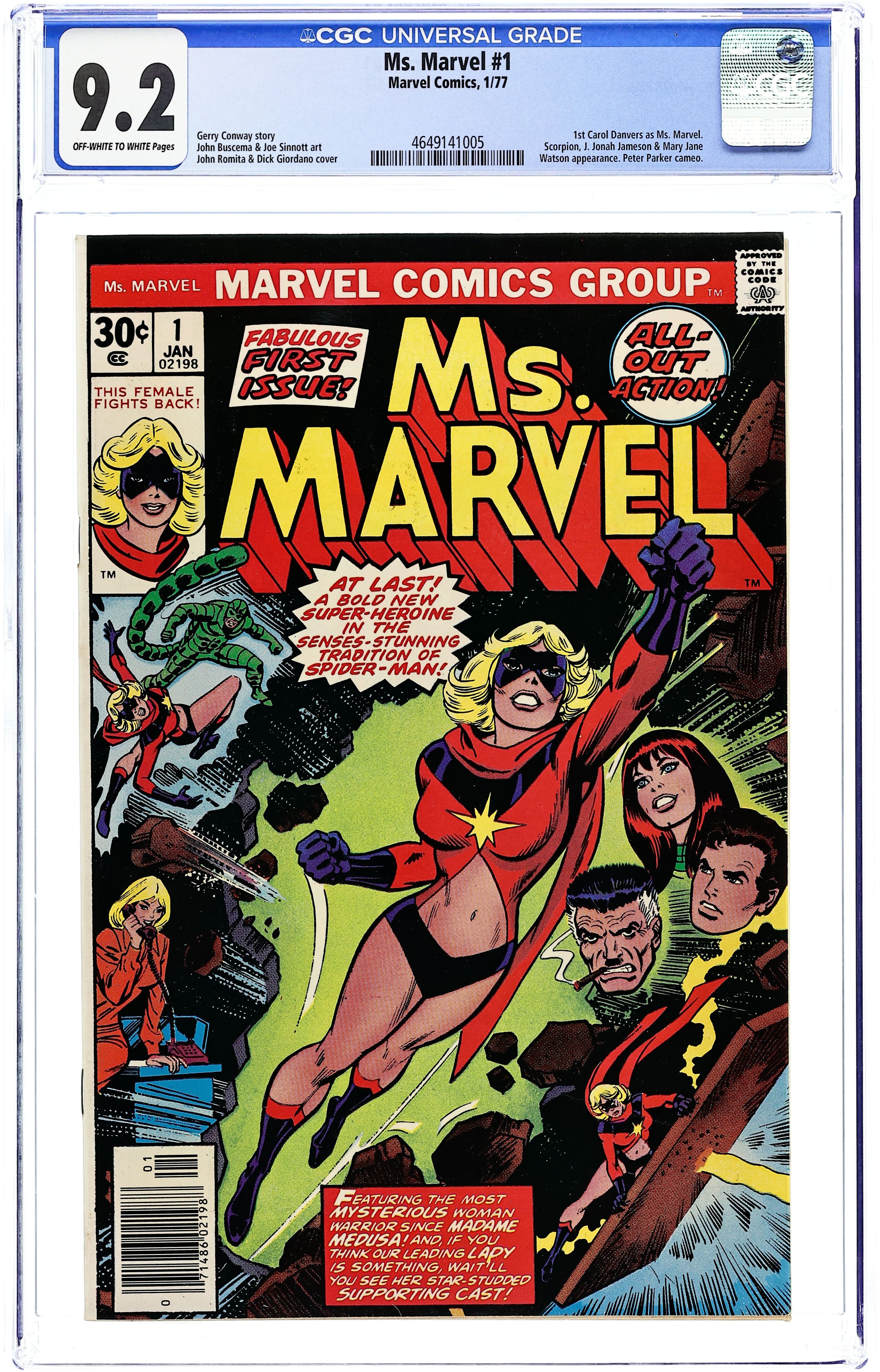 Starts Feb 2 John Romita/Dick Giordano cover. John Buscema art. Gerry Conway script. Joe Sinnott/David Hunt inks. Marie Severin colors. "This Woman, This Warrior" Carol Danvers meets Peter Parker, J. Jonah Jameson, Mary Jane Watson, and battles the Scorpion when she gets a job at the Daily Bugle as a fashion editor. Intro Ms. Marvel, Carol Danvers, who last appeared in Captain Marvel # 40. 1st appearance of Ms Marvel. 36 pages, full color. Cover price $0.30.
