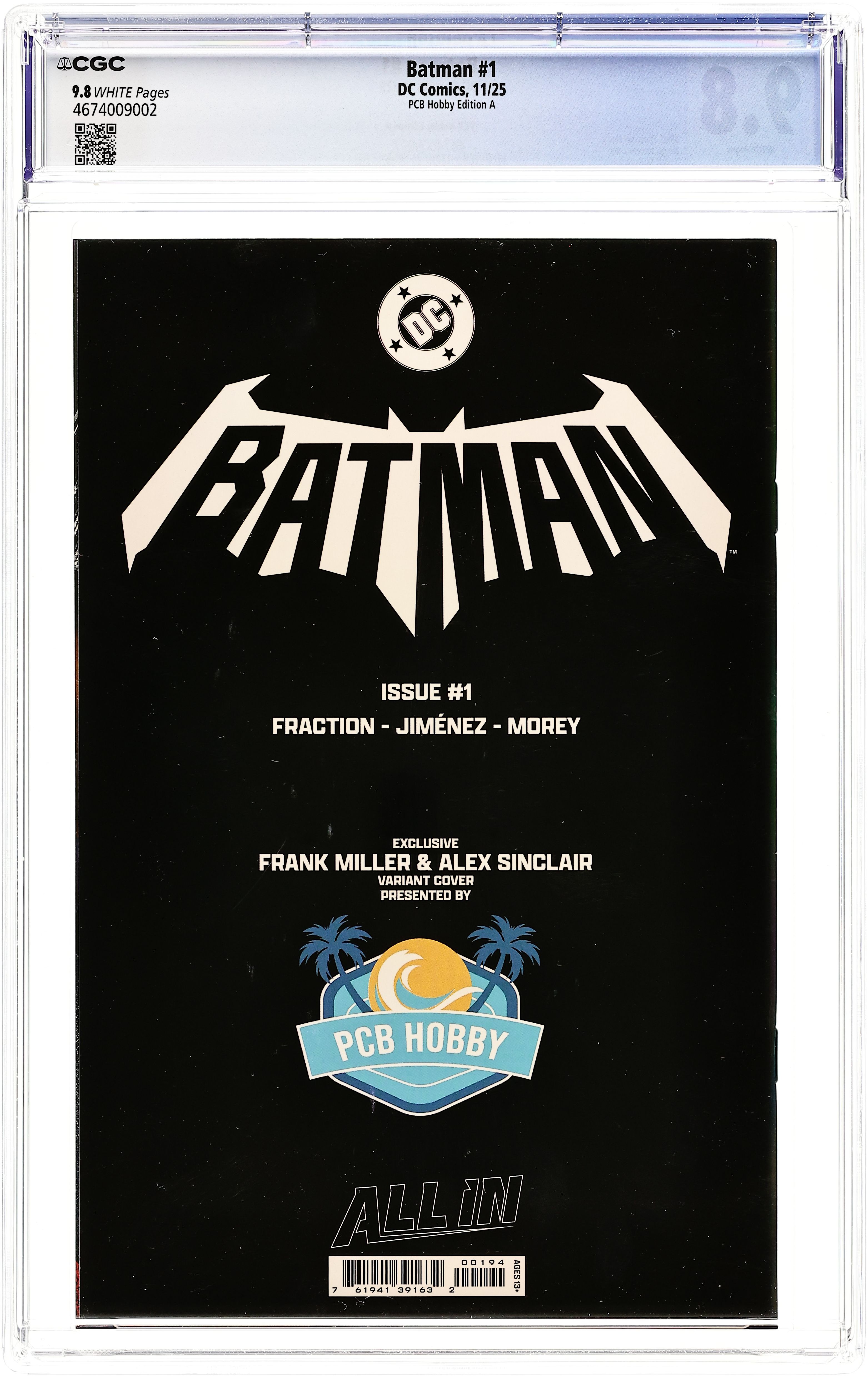 Starts Mar 2 PCB Hobby Exclusive Variant Cover by Frank Miller. Written by Matt Fraction. Art by Jorge Jimenez. A BOLD NEW ERA OF BATMAN STARTS HERE! A new day dawns for the Dark Knight Detective as Eisner Award-winning writer Matt Fraction (Hawkeye, Superman's Pal Jimmy Olsen) joins forces with superstar artist Jorge Jimenez (Batman, Summer of Superman Special) for an unforgettable new era of Batman! The best superhero in comics gets a brand-new first issue to kick off this new era that will test Batman and Bruce Wayne like never before! 40 pages, full color. Rated T+