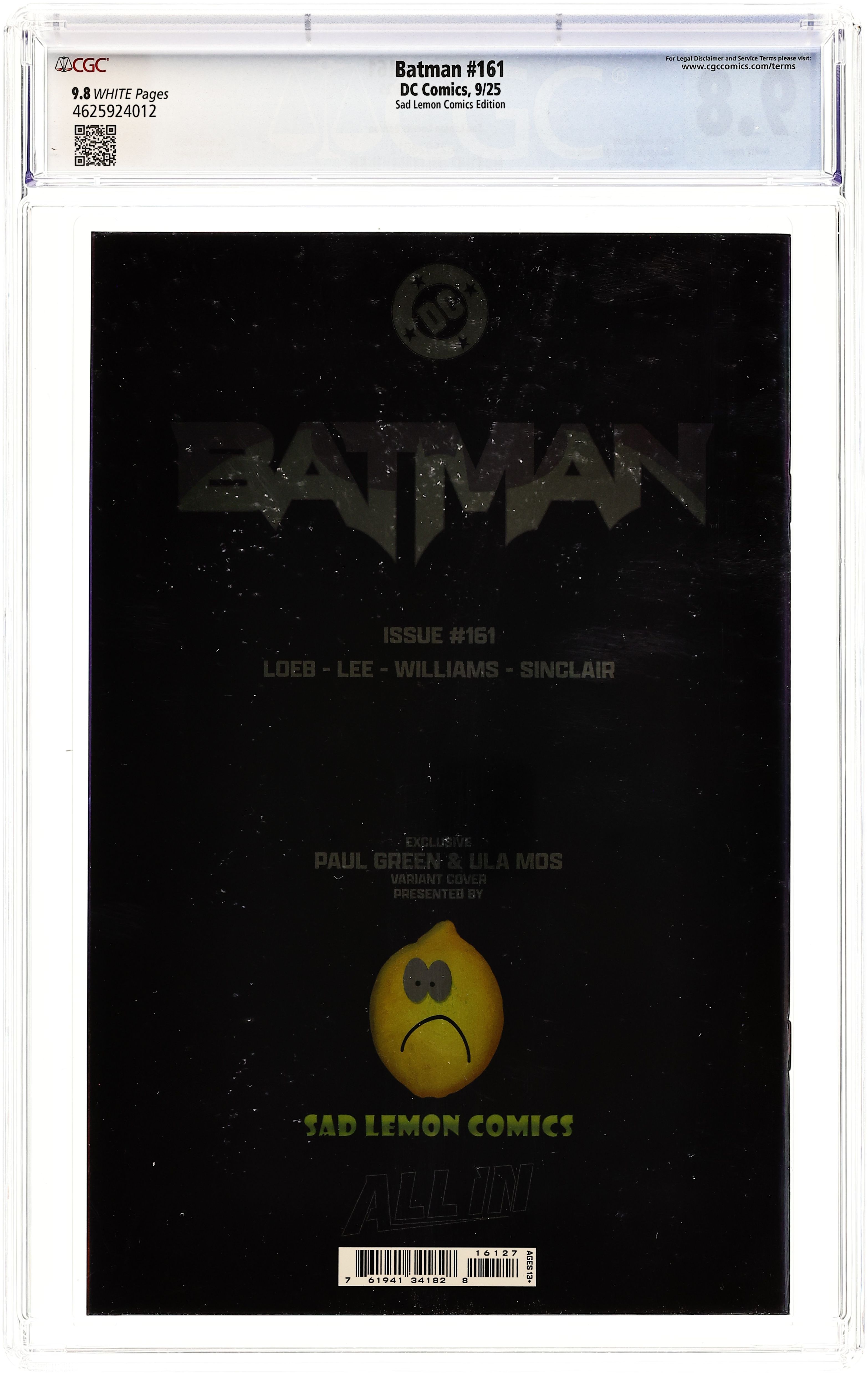 Starts Mar 9 Sad Lemon Comics Exclusive Spot Foil Edition Variant Cover by Paul Green. Written by Jeph Loeb. Art by Jim Lee, Scott Williams. H2SH WITH JEPH LOEB AND JIM LEE PART 4! Batman's battle with Hush takes a dark turn when Damian (Robin) and Bane team up! 40 pages, full color. Rated T+