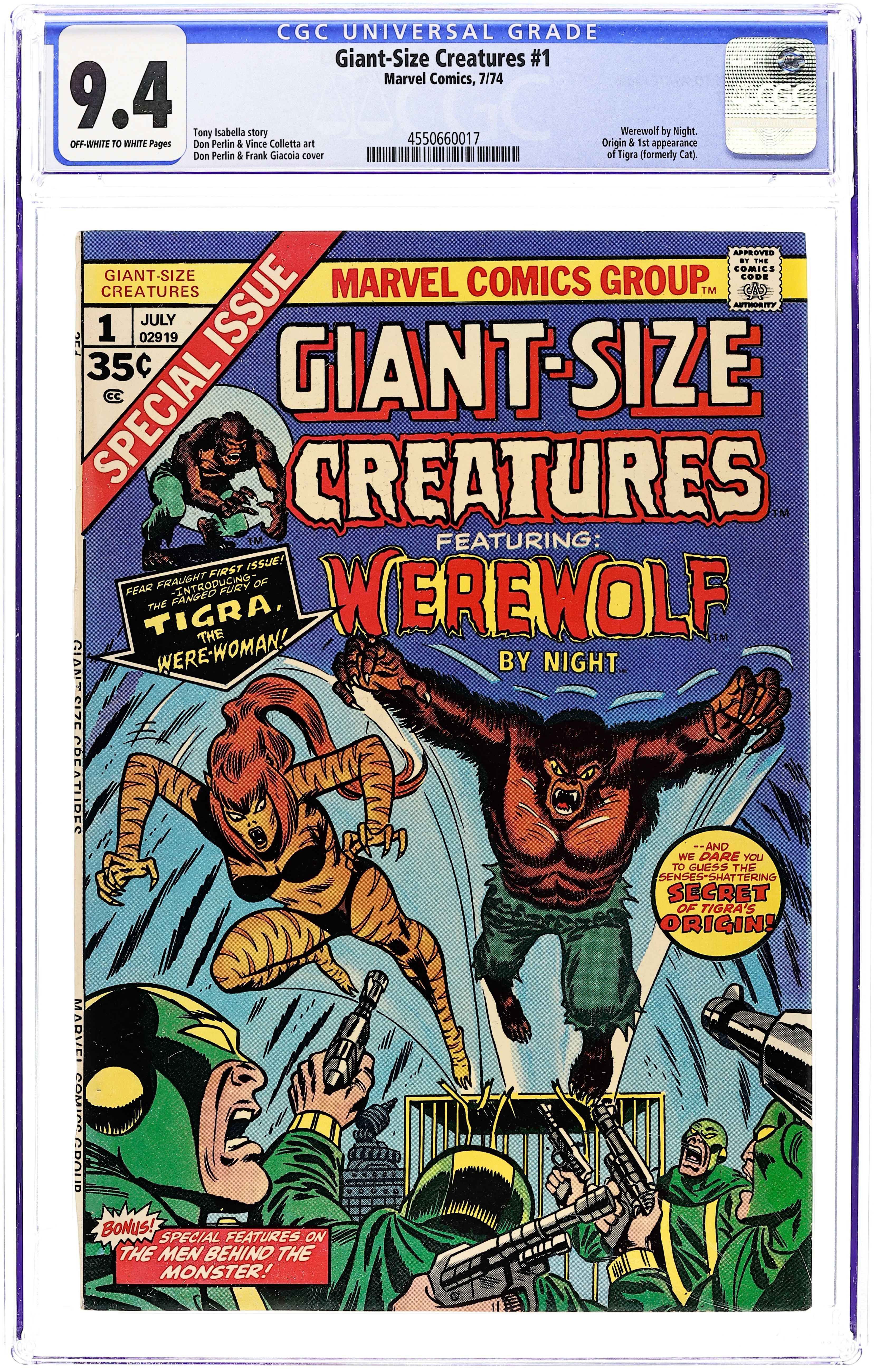 Ends Feb 23 8:17 PM CST Bid History 18 bids Current Bid $148 Your Secret Max Bid If you'd like to bid, please log in or register. 52-page giant. New story: "Tigra the Were-Woman!", script by Tony Isabella, pencils by Don Perlin, inks by Vince Colletta; Greer Nelson, formerly known as The Cat, is transformed by the Cat People into Tigra. Tigra and the Werewolf By Night free the Cat People from Hydra. "Waiter, There's a Werewolf in My Soup!" article by Roy Thomas, art by Don Perlin; Text piece detailing the origins of the Werewolf By Night strip. "Where Walks the Werewolf!" (reprinted from Creatures on the Loose #13), script by Len Wein, art by Reed Crandall; A blind man has the eyes of a wolf transplanted into himself, and becomes a werewolf. "Tigra's Year" article by Tony Isabella; Details how the ideas behind Tigra came about. Includes the original pencil design sketch of Tigra by Gil Kane. 52 pgs., full color. Cover price $0.35.