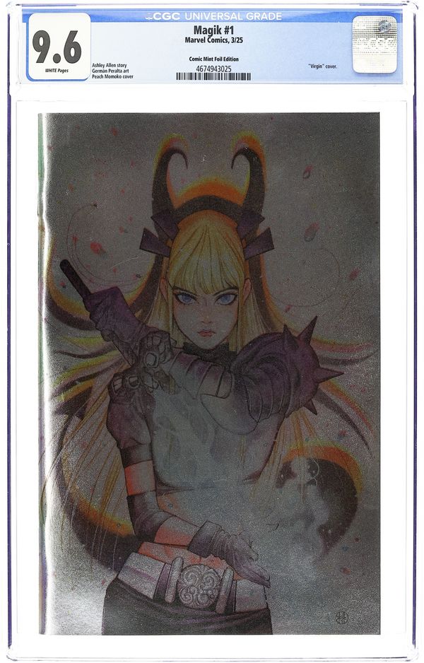 Starts Mar 2 The Comic Mint Exclusive Foil Edition Virgin Cover by Peach Momoko. Written by Ashley Allen. Art by German Peralta. THE MYSTIC MUTANT GOES DEMON HUNTING IN HER OWN NEW, ONGOING SERIES! The X-Man Ilyanna Rasputina strikes out on her own with new allies and dark powers arrayed against her. Something ancient has awakened beneath the Alaskan ice. Unfortunately for it, that's Magik's territory now! Written by rising star Ashley Allen (X-MEN: BLOOD HUNT - MAGIK, MARVEL ZOMBIES: BLACK, WHITE & BLOOD) and illustrated by the incomparable Germán Peralta (LOKI, BLACK PANTHER), this is a stylish, high-octane demon-hunting adventure starring the fiercest X-Man of them all! 32 pages, full color. Rated T+