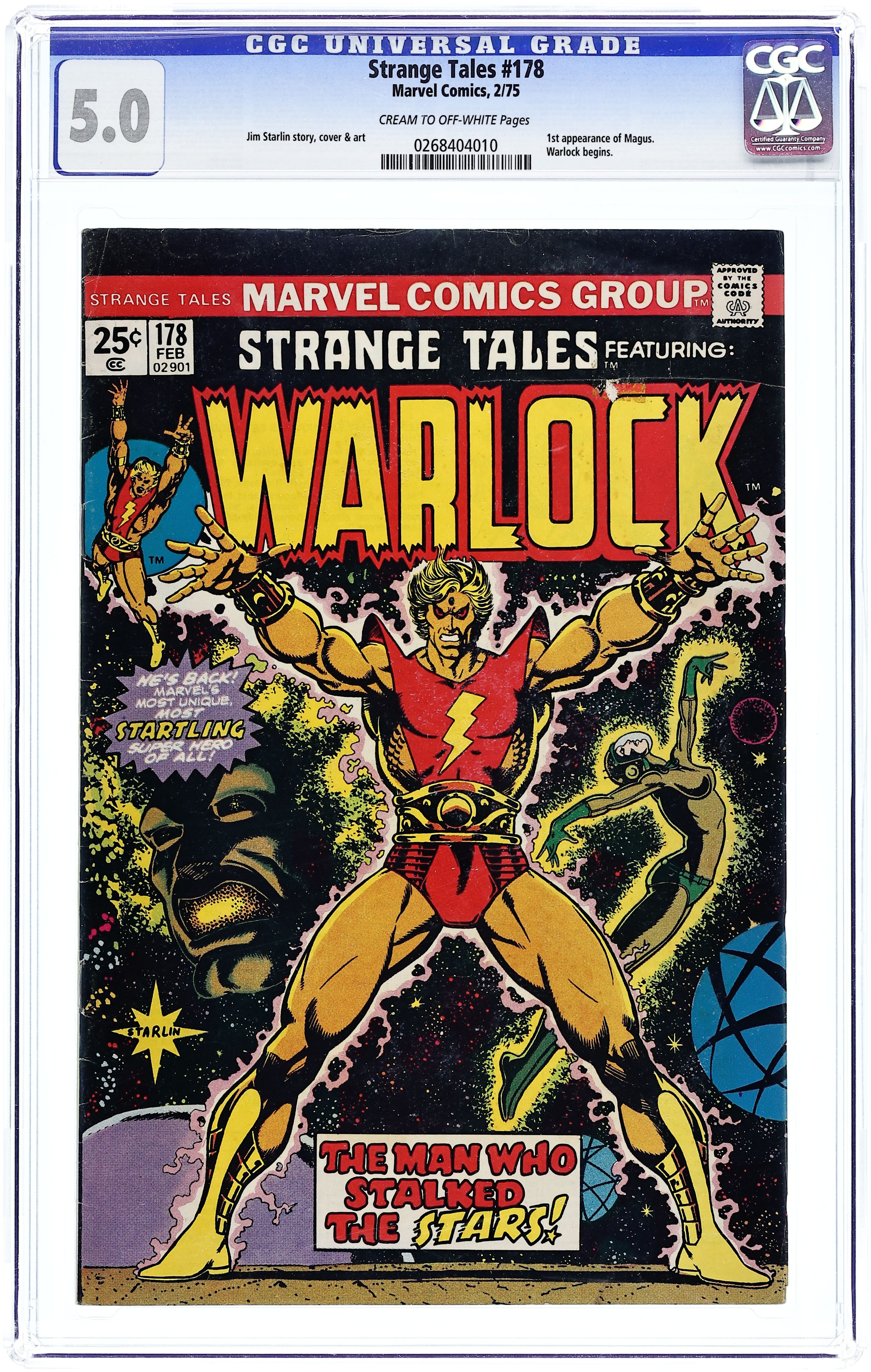 Starts Mar 2 Cover art by Jim Starlin. Warlock begins in this title in "Who Is Adam Warlock?", script and art by Jim Starlin; Sphinxor retells the Origin of Warlock, his encounters with Thor and the High Evolutionary, the Creation of Counter-Earth and Warlock's Battle against the Man-Beast; First appearance of the Magus; Cameo appearances by the Hulk. The story continues from Incredible Hulk 178. 36 pgs., full color. Cover price $0.25.