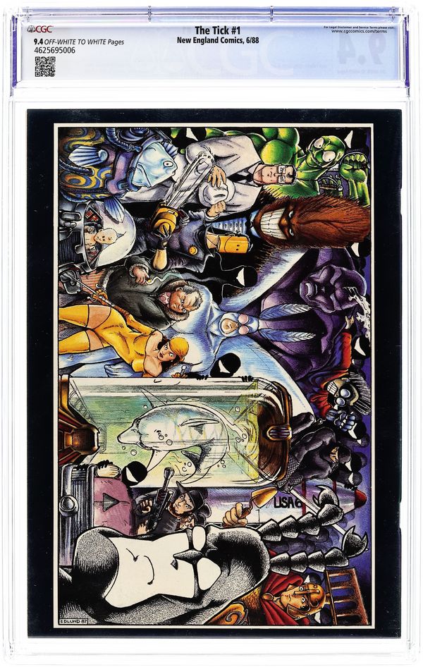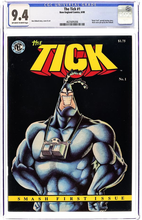 Starts Feb 23 (2nd Edition) inside cover. This is a first printing of Tick #1, but Tick #1 reprints the serially numbered Tick Special Edition (1st appearance) w/minor changes. NOTE: This is a 1st Printing. 1st printings do not have a 2nd or later printing notice in indicia. Written by Ben Edlund. Art and cover by Ben Edlund. The Tick arrives straight from the nuthouse and into The City where he decides to be a superhero; After having a tussle with ninjas and being run over by a train, he is no closer to realizing his lofty goals. One page art lesson on how to draw The Tick by Ben Edlund. 36 pgs., B&W. $1.75. Cover price $1.75.