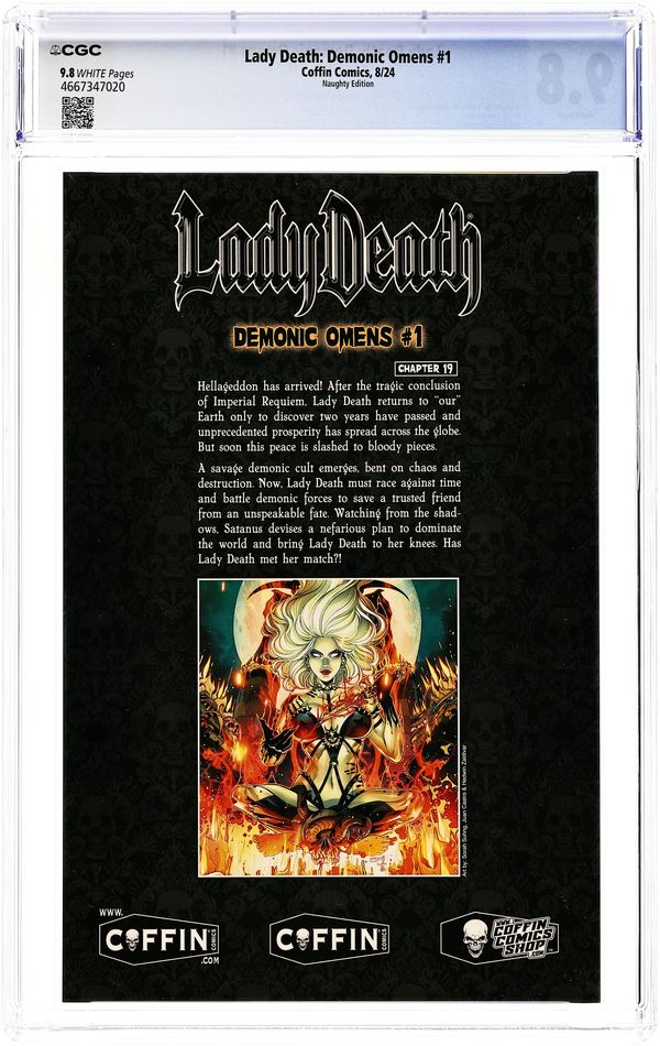Published Aug 2024 by Coffin Comics.Lady Death Demonic Omens (2024 Coffin Comics) Kickstarter 1NAUGHTY CGC 9.8