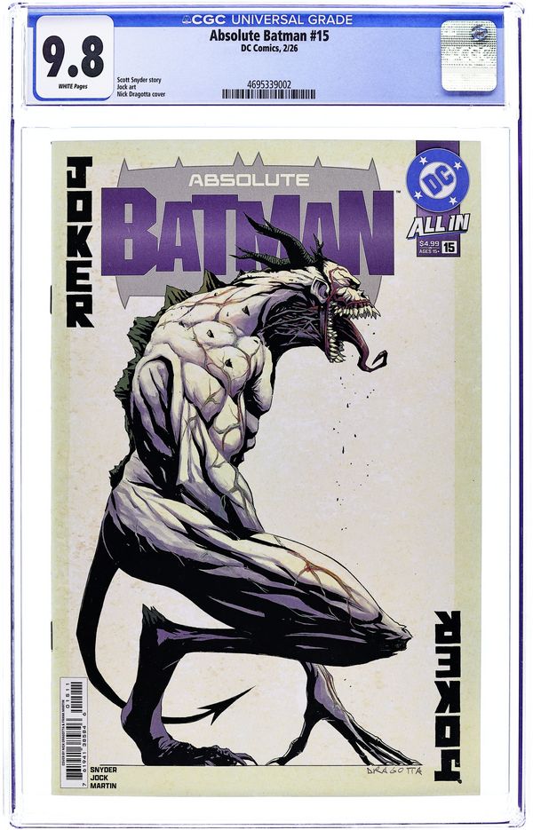 Starts Apr 4 (W) Scott Snyder (A) Jock (CA) Nick Dragotta SCOTT SNYDER REUNITES WITH LEGENDARY ARTIST JOCK! Alfred reveals to Bruce the story of the man hes been chasing for years. Enter: Joker! Scott Snyder and Jock reunite for an epic tale in the Absolute Universe! 32 pages, full color, rated 15+. Cover price $4.99.