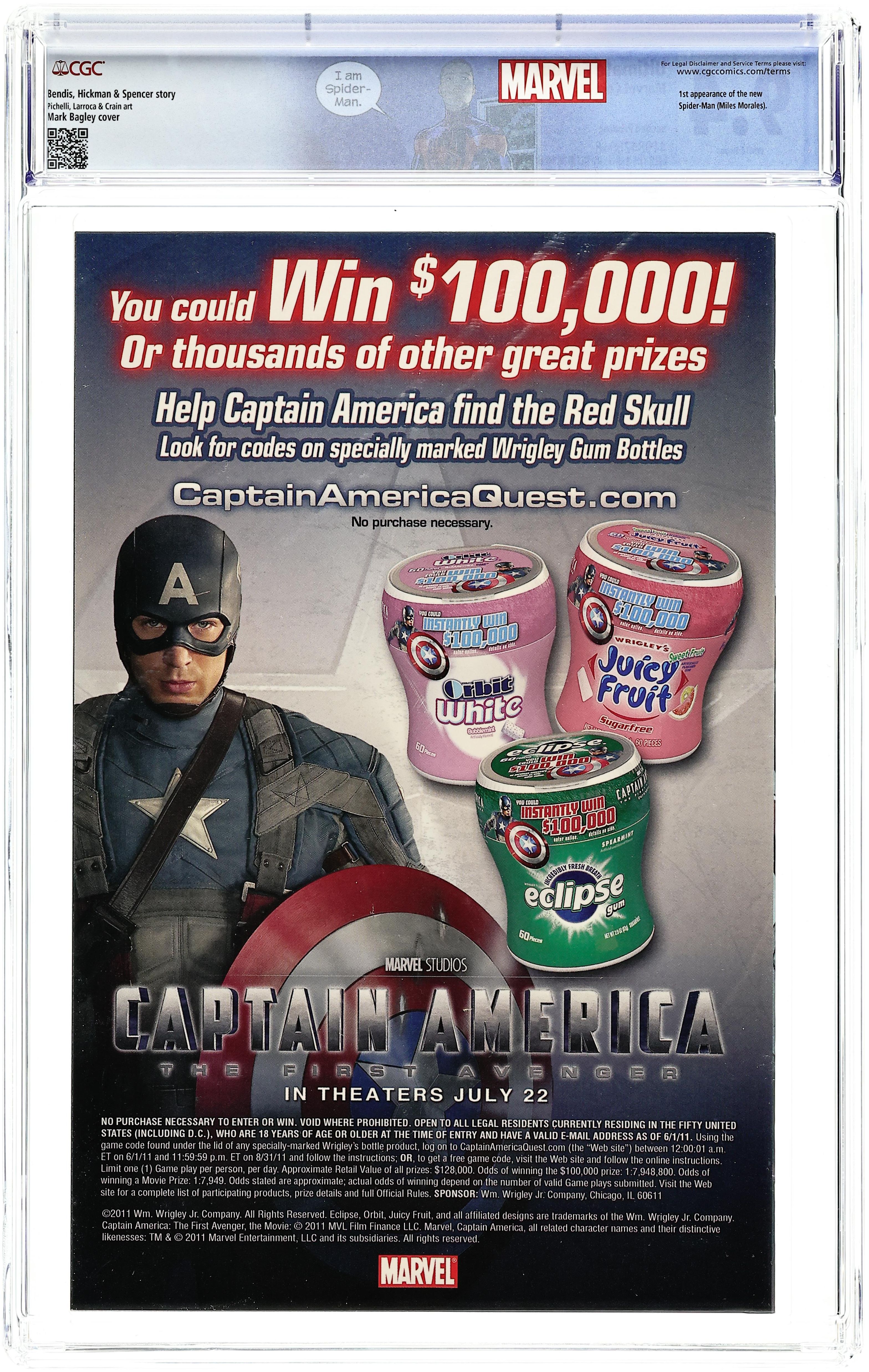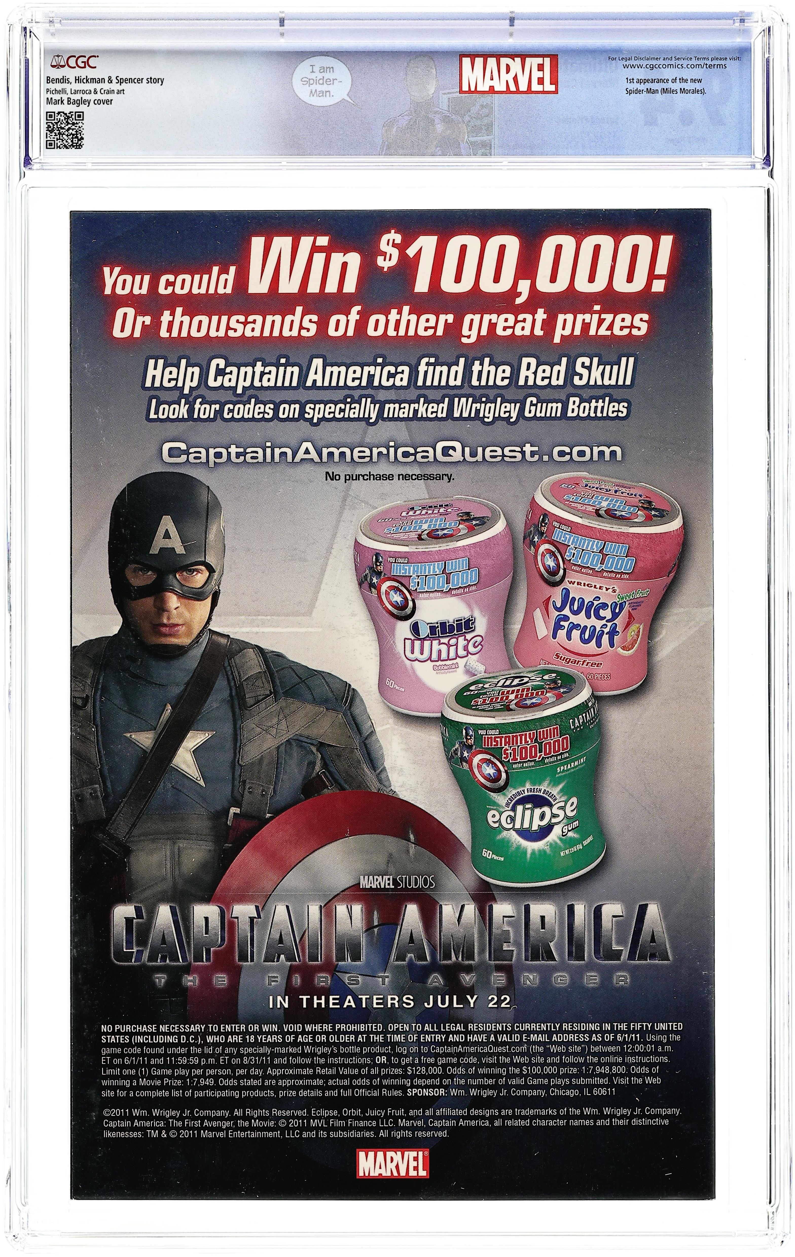 Ends Dec 8 9:49 PM CST Bid History 7 bids Current Bid $29 Your Secret Max Bid If you'd like to bid, please log in or register. 2nd Printing. Written by BRIAN BENDIS, JONATHAN HICKMAN & NICK SPENCER. Art by SARA PICHELLI, SALVADOR LARROCA & CLAYTON CRAIN. Cover by MARK BAGLEY. What will become of Captain America? Where have all the X-Men gone? And what is up with the new Spider-Man suit? Don't miss the final chapters of one of the most talked about Ultimate events ever. 32 PGS. (each)/Rated T+...$3.99 (each) Cover price $3.99.