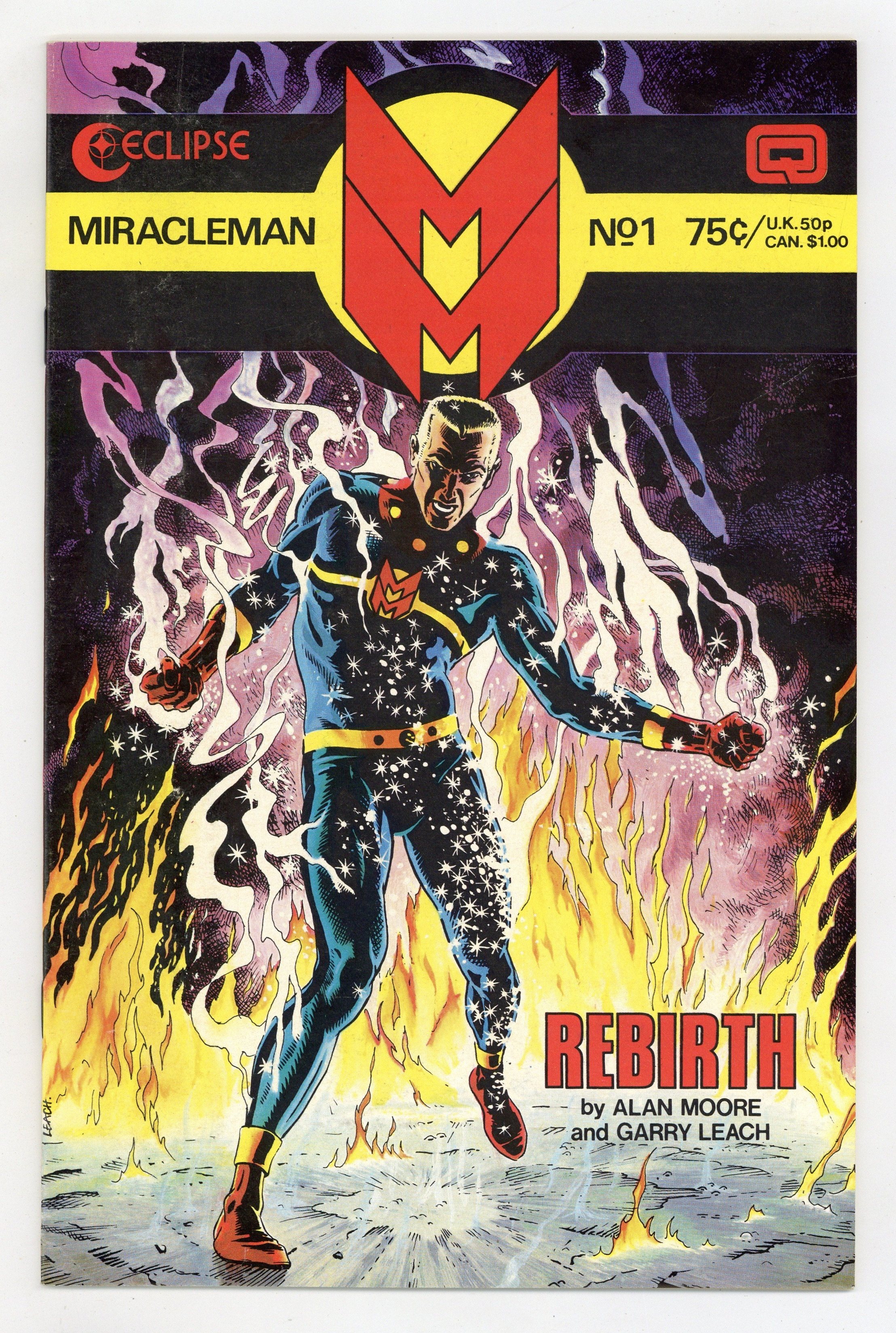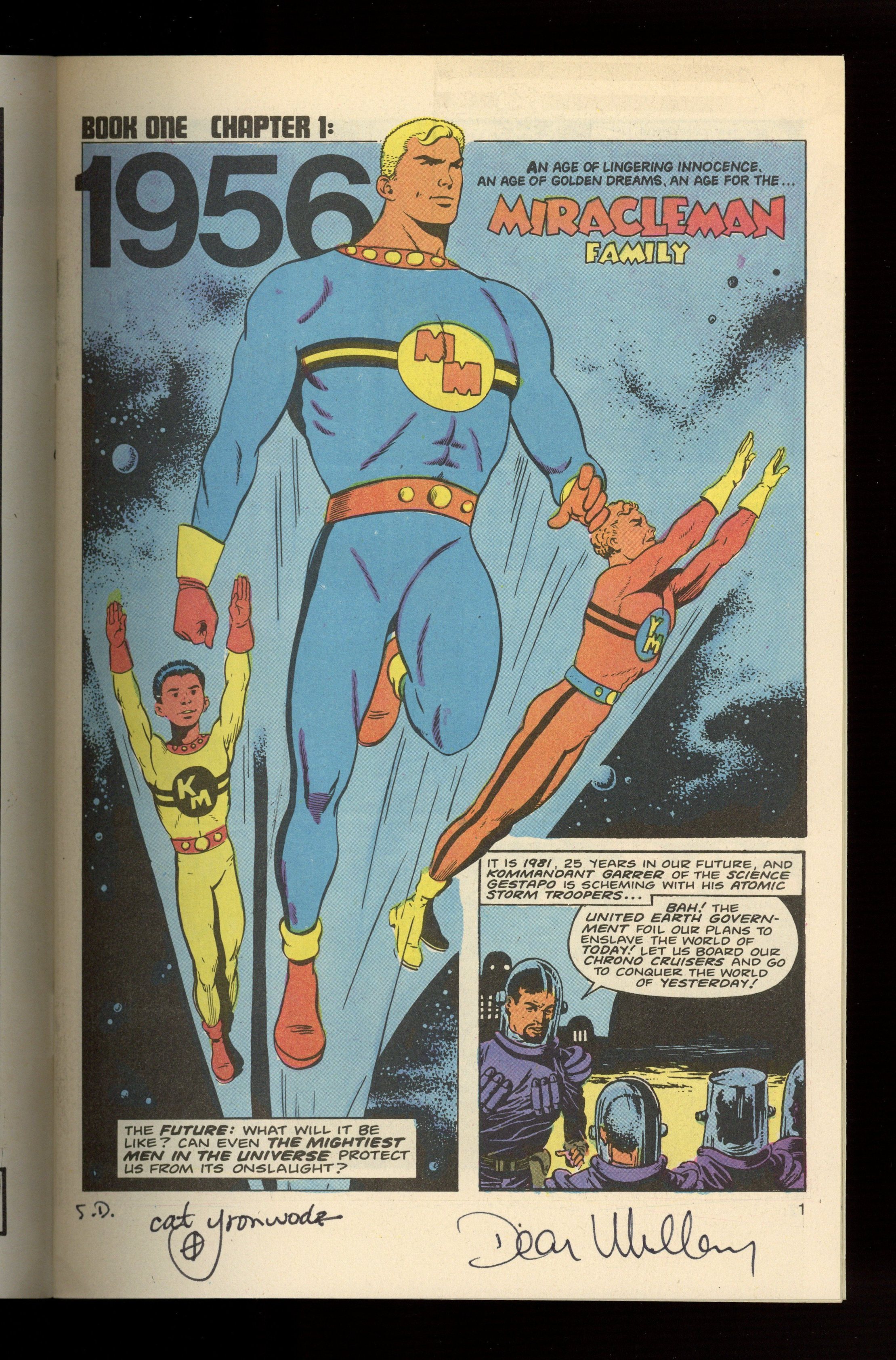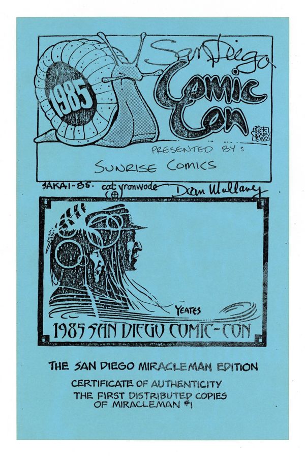 Starts May 11 Blue San Diego Miracleman Edition with BLUE certificate of authenticity. Signed by Cat Yronwode and Dean Mullaney (interior) but not numbered. NOTE: The blues are part of the first 1000 copies of Miracleman #1 printed. The first 400 with gold certificates are signed & numbered by Alan Moore. The remaining 600 were given blue certificates and signed by Cat Yronwode and Dean Mullaney but not numbered. These first 1000 copies all have a printing crease on the front cover. CONTENT INFO: Written by Alan Moore, with art by Gary Leach. Mickey Moran was just a regular bloke with a wife and a job, until one day he *remembered*...that he was Miracleman, a glistening new god with powers far beyond those of mortal ken. He also remembered that, years ago, he and his sidekicks -- Young Miracleman and Kid Miracleman -- were in a horrible accident that left Young Miracleman dead. When Moran goes to see Kid Miracleman to help him piece together his past, our hero finds that his youthful protege has changed...for the worse. Much worse. If you've never read this series, be assured it ranks right up there with Alan Moore's other classic, Watchmen. Cover price $0.75.