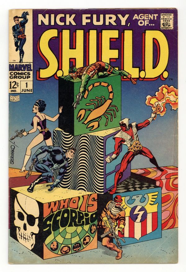Starts Dec 15 Cover by Jim Steranko. First appearance of Scorpio in "Who Is Scorpio?", script by Jim Steranko, pencils by Jim Steranko, inks by Joe Sinnott; Fury sneaks into an island fortress, only to get shot in the back. Surprise!; It's an L.M.D., and the shooter is the real Fury!; But on examination, Dugan informs Fury the L.M.D.'s been shot 4 times, not 3 - which means, someone tried to assassinate him!; The only clue is a tiny badge with a "Scorpio" symbol on it; In San Francisco, comic Flip Mason's on the run from gambling debts; In Kansas City, racketeer Mitch Hackett looks forward to joining the mob. In NYC, Fury & Val walk in the rain; At the Monza Autodrome, Count Julio Scarlotti wins a race - and we see he has a Scorpio tattoo on his wrist; Days later in Nevada, Fury helps test an "EPB G-System" (Entrope Phase Barrier Guard System), a force field which is hoped may one day protect entire armies. As SHIELD prepares one final test (with an H-Bomb!) we see the tech firing the missile has a Scorpio tattoo on his wrist; Fury suddenly realizes the EPB's down, and nobody answers his comm; He races across the desert to a rocket sled used by NASA to escape as the missile descends on the spot he was relaxing; At the U.S. Government Research Center in Las Vegas, everyone's been put to sleep with gas by Scorpio - when Fury arrives via motorcycle. Letter to the editor from comics writer Don McGregor. Cover price $0.12.