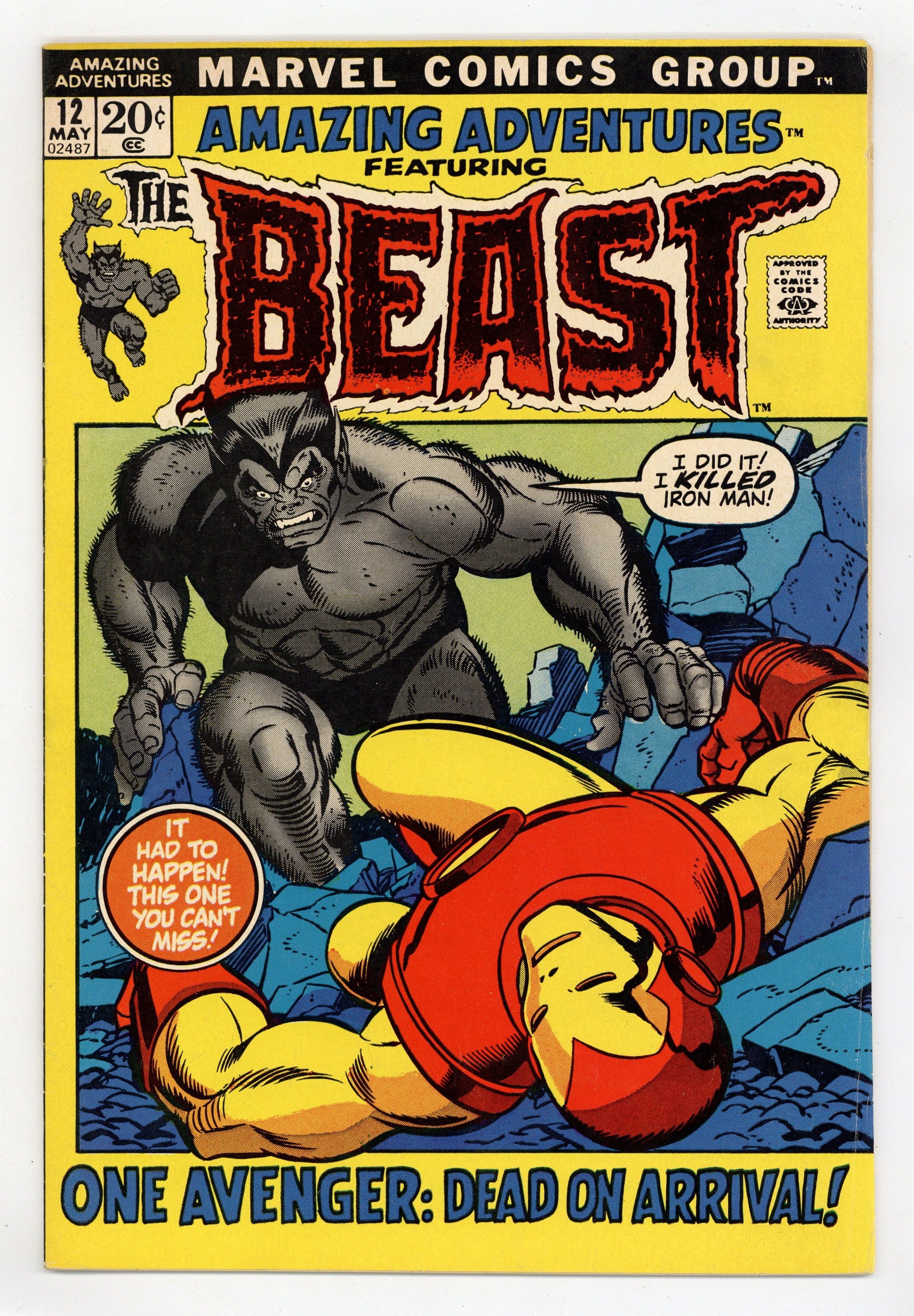Starts Mar 23 Cover pencils by Gil Kane, inks by Joe Sinnott. "Iron Man: D.O.A.", script by Steve Englehart, pencils by Tom Sutton, inks by Mike Ploog; The military is out looking for the Beast in connection with the death of Carl Maddicks, scientist working for the Brant Corporation, and unknown to everyone secretly giving secrets to a enemy organization; While hiding out, Beast reflects back on the events that led to him turning into a hairy beast and how he cannot change back to his normal form; As he is hiding, the Beast is contacted telepathically by Marvel Girl and Professor X; Mastermind, Unus the Untouchable, and the Blob appear. 36 pgs, full color. $0.20. Cover price $0.20.