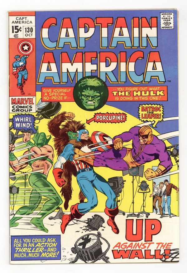 Starts Dec 22 Cover pencils by Marie Severin, inks by Joe Sinnott. Batroc, Whirlwind, and Porcupine team up against Captain America in "Up Against the Wall," script by Stan Lee, pencils by Gene Colan, inks by Dick Ayers; Captain America stumbles onto the Hood's plan to convince students to riot at a Midwestern university; After rescuing a dean from said riot, Cap is asked to make public service announcement condemning the students; While he mentions that violence shouldn't be the answer, Cap mostly condemns the dean; The Hood hires Batroc's Brigade to attack Cap. Cameos by the Hulk and Peter Parker (Spider-Man). 36 pgs., full color. $0.15. Cover price $0.15.