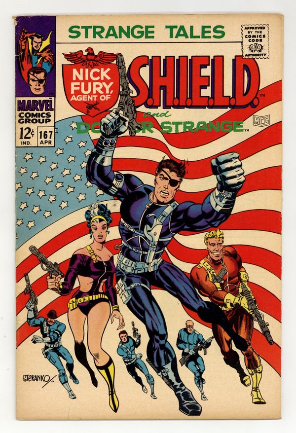 Starts Jan 3 Cover art by Jim Steranko. Nick Fury stars in "Armageddon!", script and pencils by Jim Steranko, inks by Joe Sinnott; While Jimmy Woo cradles the body of Suwan in his arms a SHIELD Suicide Squad bursts in via The Dreadnought, a colossal tunneling machine; The Claw vanishes but Fury uses a Pseudo-Elliptoid Wrist Tracer to find him, but arrives just as the villain escapes into the Space-Time Continuum in an Infinity Sphere; Fury finds a Prototype Warp-Vest and follows The Yellow Claw as they have a psychic duel. "This Dream—This Doom!", script by Dennis O'Neil and Dan Adkins (co-plot), art by Dan Adkins; The Ancient One is alive and tells Strange he made Zom believe he was dead so he could pass on his powers to his disciple; With the Cosmic Balance restored he was able to shatter the spell that bound him; In his Himalayan retreat Strange and the Ancient One discover that Victoria Bentley is a prisoner in the Dimension of Dreams; Using a mystic gem and with his mentor to mentally guide him Strange travels to Victoria. Ad for Not Brand Echh and Daredevil. Statement of ownership--average print run 428.603; average paid circulation 241,561. 36 pgs., full color. Cover price $0.12.