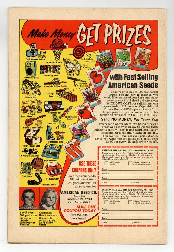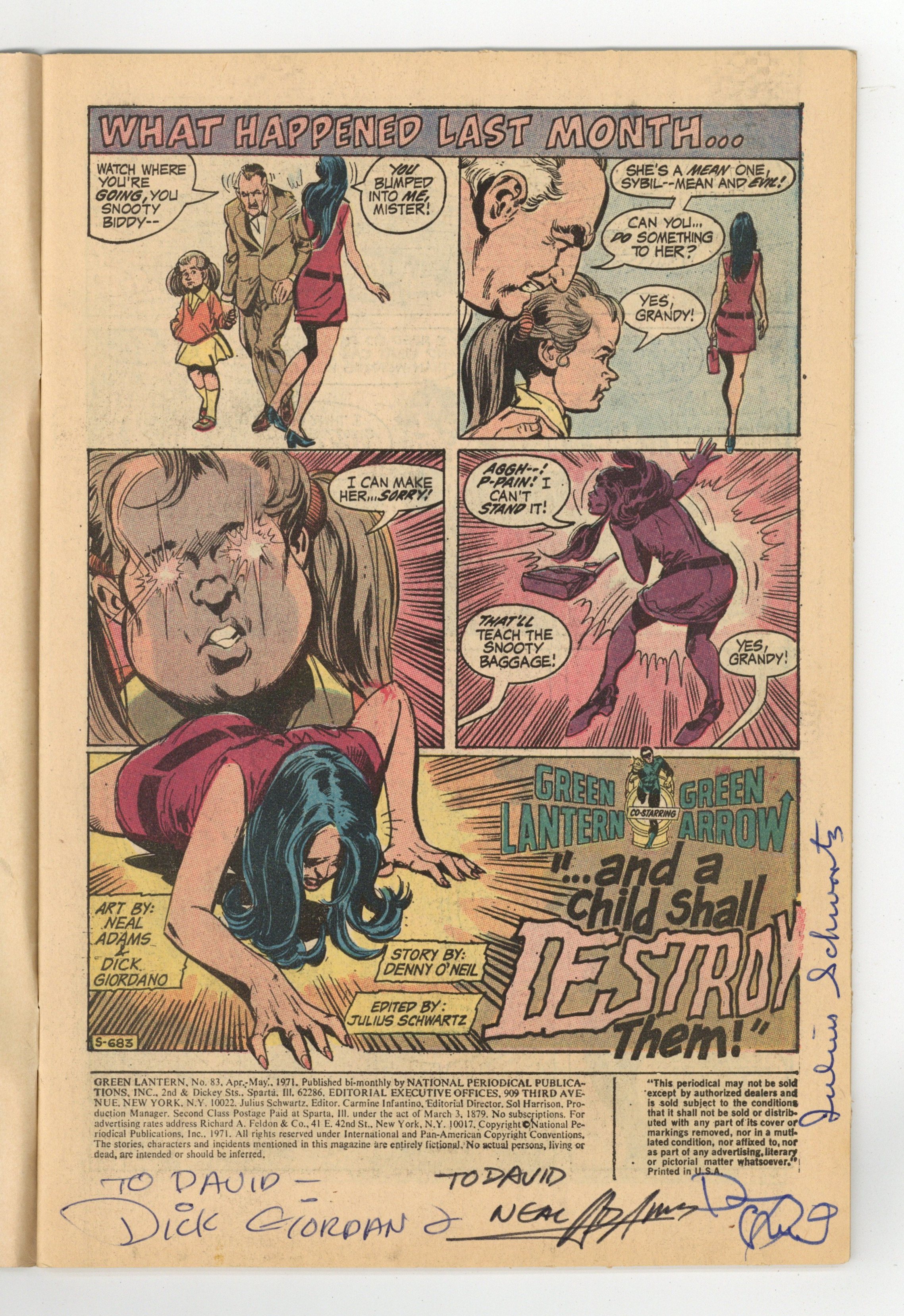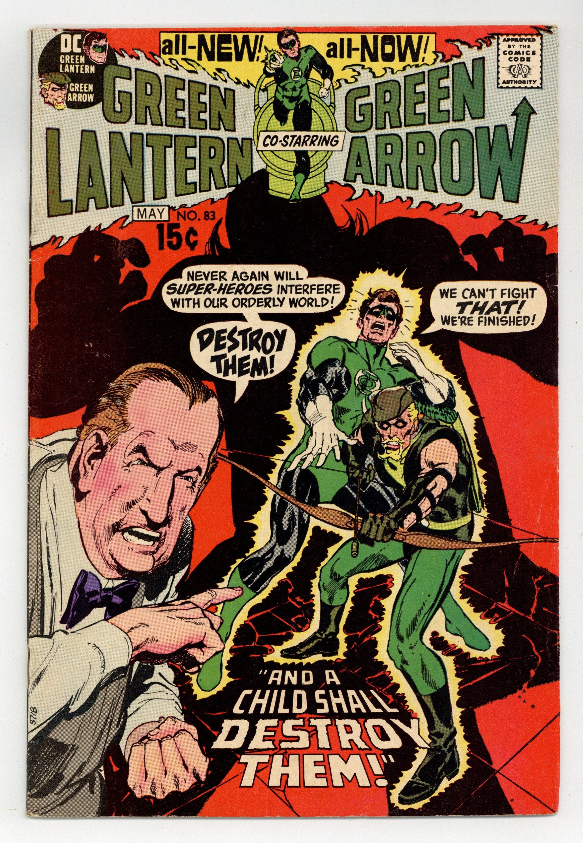 Starts Apr 27 Cover art by Neal Adams. ...And a Child Shall Destroy Them!, script by Denny O'Neil, pencils by Neal Adams, inks by Dick Giordano; Green Lantern and Green Arrow accompany Dinah as she begins a job at a private school where they are greeted by the cook Grandy, a little girl with psychic powers named Sybil, and the owner Jason Belmore; After Belmore asks the costumed heroes to leave, Dinah is confronted by Grandy, who explains that in Sybil he finally found a way to keep the children of the school in order. Green Lantern and Green Arrow return to the school in time to save Dinah, and when Grandy orders Sybil to attack GL, she refuses and brings down the roof on herself and Grandy. The appearances of two characters are based on Richard Nixon and Spiro Agnew! Statement of ownership--average print run 282,122; average paid circulation 133,836. 32 pgs. $0.15. Cover price $0.15.