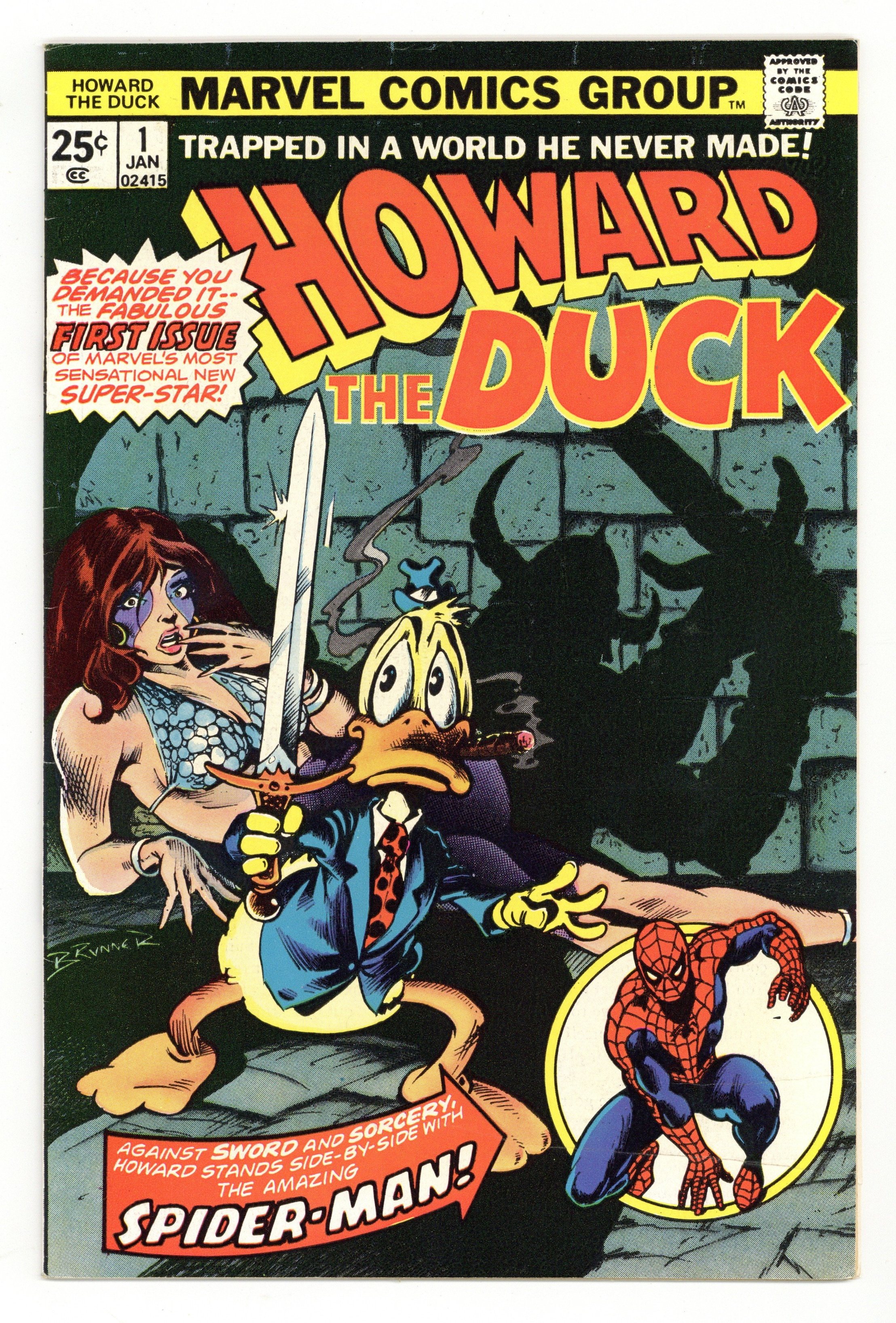 Starts Jan 3 Written by Steve Gerber. Art by Frank Brunner and Steve Leialoha. Cover by Frank Brunner. Howard the Barbarian; Legendary creators Steve Gerber and Frank Bruner present the audacious, quirky, downright filthy Howard the Duck in his own ongoing series!; Howards debut adventure guest stars a plethora of Marvel Heroes--Spider-Man, Conjurer, and many more; Howard is thinking of committing suicide and then finds himself involved in a bizarre adventure where he meets Beverly Switzler and Spider-Man for the first time, and faces off against Pro-Rata, the Financial Wizard. Continued from Giant-Size Man-Thing #5. 36 pgs., full color. $0.25. Cover price $0.25.