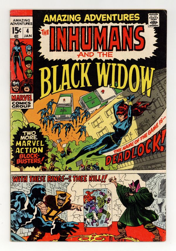Ends Dec 8 7:12 PM CST Bid History 5 bids Current Bid $6 Your Secret Max Bid If you'd like to bid, please log in or register. Cover pencils by John Buscema, inks by John Verpoorten. "With These Rings, I Thee Kill!", script and pencils by Jack Kirby, inks by Chic Stone; Black Bolt removes the eye from the statute of Yin, but it speeds off as the Mandarin uses one of his rings to draw it to him. The Inhumans split up to set off searching for it and discover the Mandarin just after he has dissolved the sphere and absorbed its power; The Inhumans battle the Mandarin, defeat him, remove his rings and discard them underground while sealing in the cavern. "Deadlock," script by Mimi Gold, pencils by Gene Colan, inks by Bill Everett; The Black Widow tries to persuade the Young Warriors to leave Scarola's house. She buys them a separate building and they leave Scarola's building. Letter to the editor from comic editor Paul Levitz. 36 pgs, full color. $0.15. Cover price $0.15.