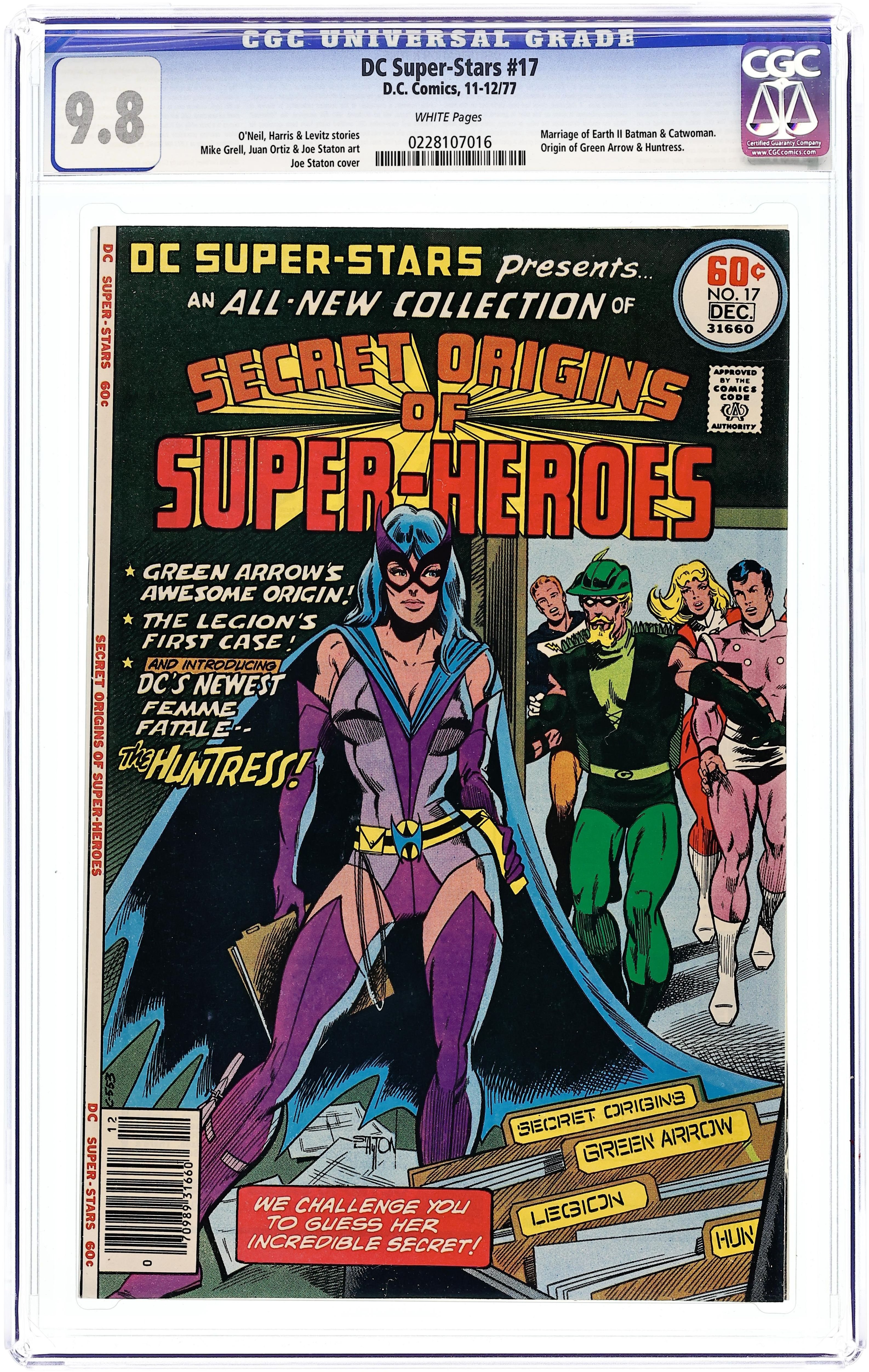 Starts Jan 3 Secret Origins of Super-Heroes -- an all-new collection! Green Arrow's awesome origin! The Legion's first case! And introducing DC's newest femme fatale -- the Huntress! Featuring: 1 page Legion of Super-Heroes; Huntress; Green Arrow story "Secret Origins of Super-Heroes" written by Paul Levitz and drawn by Jim Aparo; 10 page Green Arrow story "Origin of Green Arrow" written by Denny O'Neil and drawn by Mike Grell & Bruce Patterson; 10 page Legion of Super-Heroes story "The Secret of the Quintile Crystal!" starring the Legion of Super-Heroes [Cosmic Boy; Saturn Girl; Lightning Lad] (origin retold), Superman (cameo), R.J. Brande and Lord Lorval (villain), written by Jack C. Harris and drawn by Juan Ortiz & Bob Smith; 1 page text article "Secret Origins of Secret Origins" by Paul Levitz; 1 page Huntress illustration "Huntress Concept Art" drawn by Joe Staton (concept sketch) and Joe Orlando (cover design); 13 page Huntress story "From Each Ending...A Beginning!" starring Huntress [Helena Wayne] (origin), Batman (Earth-2), Catwoman (Earth-2), Flash [Barry Allen] (flashback), Flash [Jay Garrick] (flashback), Robin (Earth-2, flashback), Silky Cernak (villain) and Commissioner Gordon (Earth-2, cameo), written by Paul Levitz and drawn by Joe Staton & Bob Layton. Cover by Joe Staton & Bob Layton. Note : First appearance of second Huntress (Helena Wayne). This is shared by All Star Comics (1940-1978) #69 as they came out on the same day. Cover price $0.60.