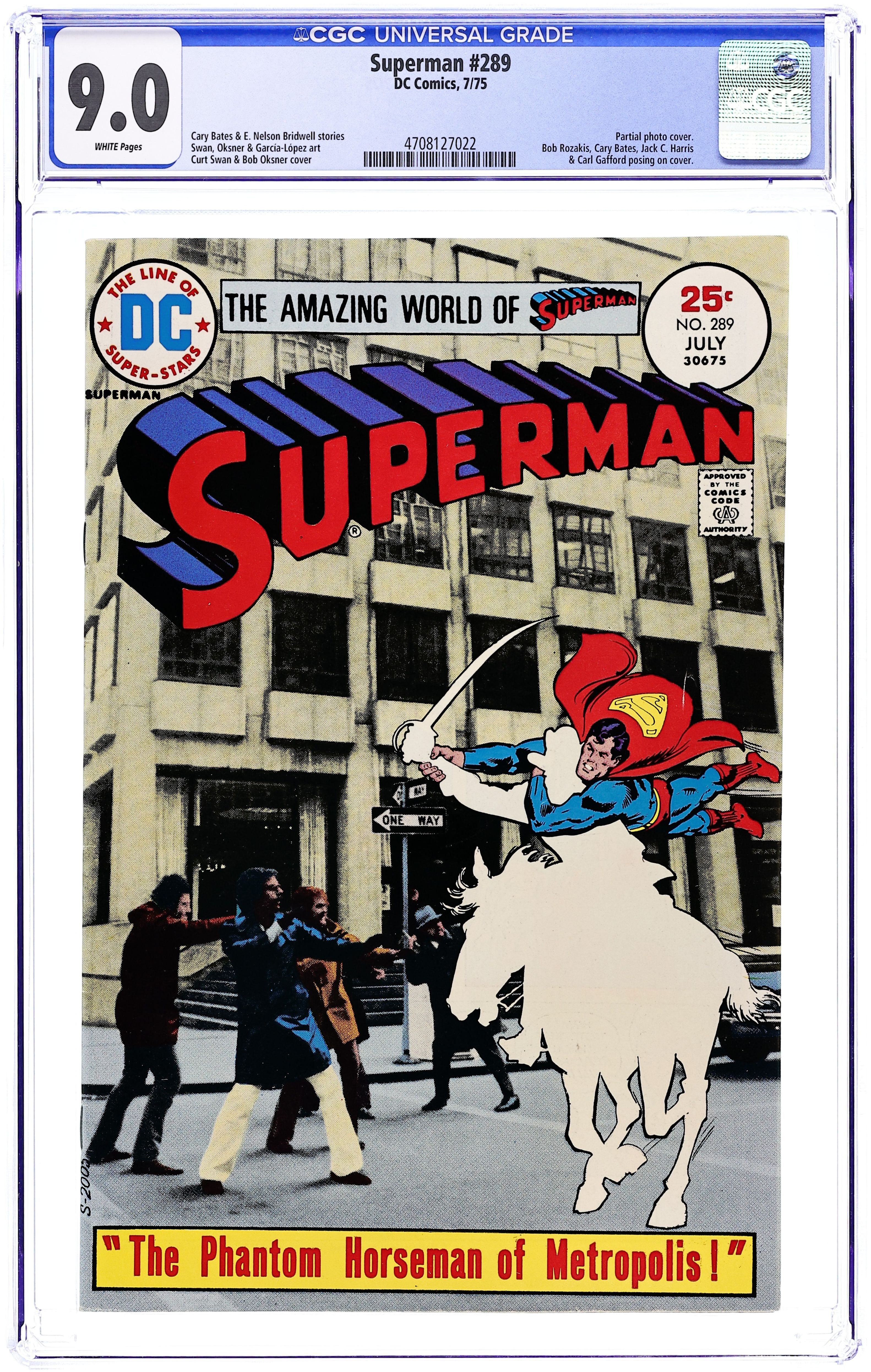 Starts May 25 Cover pencils by Curt Swan, inks by Bob Oksner. The Phantom Horseman of Metropolis!, script by Cary Bates, pencils by Curt Swan, inks by Bob Oksner; Superman must confront Professor Pepperwinkle, who creates tangible silhouettes of TV images. Right Down My Alley!--Private Life of Clark Kent, script by E. Nelson Bridwell, pencils by Curt Swan, inks by Jose Luis Garcia-Lopez; Clark bowls without super powers. 36 Pages, Full Color. Cover price $0.25.