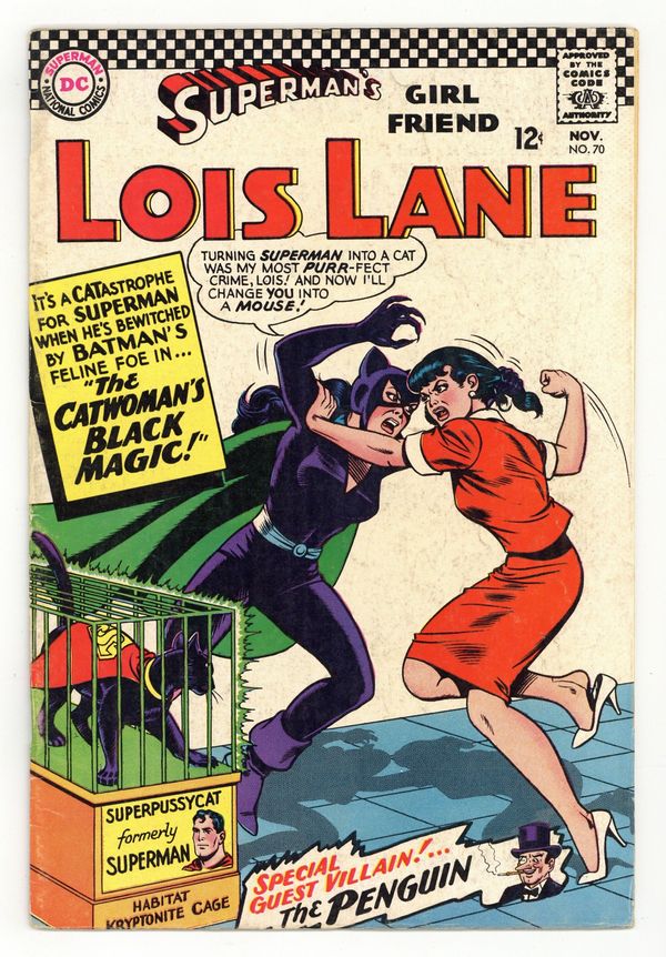 Starts Jan 3 1st Silver Age appearance of Catwoman (see next issue for 2nd appearance & Detective Comics for #369 for 3rd appearance). Cover art by Kurt Schaffenberger. The Catwoman's Black Magic! [Part I], script by Leo Dorfman, art by Kurt Schaffenberger; When the Penguin escapes from prison, Lois tries to track him down but she is kidnapped by Catwoman instead, who hypnotizes her into acting as the villainess's double. House ad for Plastic Man #1. The Catwoman Gets the Bird! (Part II), script by Leo Dorfman, art by Kurt Schaffenberger; The Penguin confronts Lois, thinking she's Catwoman, but Superman, Batman, and Robin show up to take the Penguin back to prison. Superman's Cat-astrophe! (Part III); Catwoman takes Lois's place and tricks Superman into taking her to her lair, where she uses Circe's magic wand to turn him into a cat. Magic Photo Kit featuring Batman and Robin, pencils by Carmine Infantino, inks by Joe Giella. House ad for Justice League of America #48. GI Joe Club ad, art by Irv Novick. 36 Pages, Full Color. Cover price $0.12.