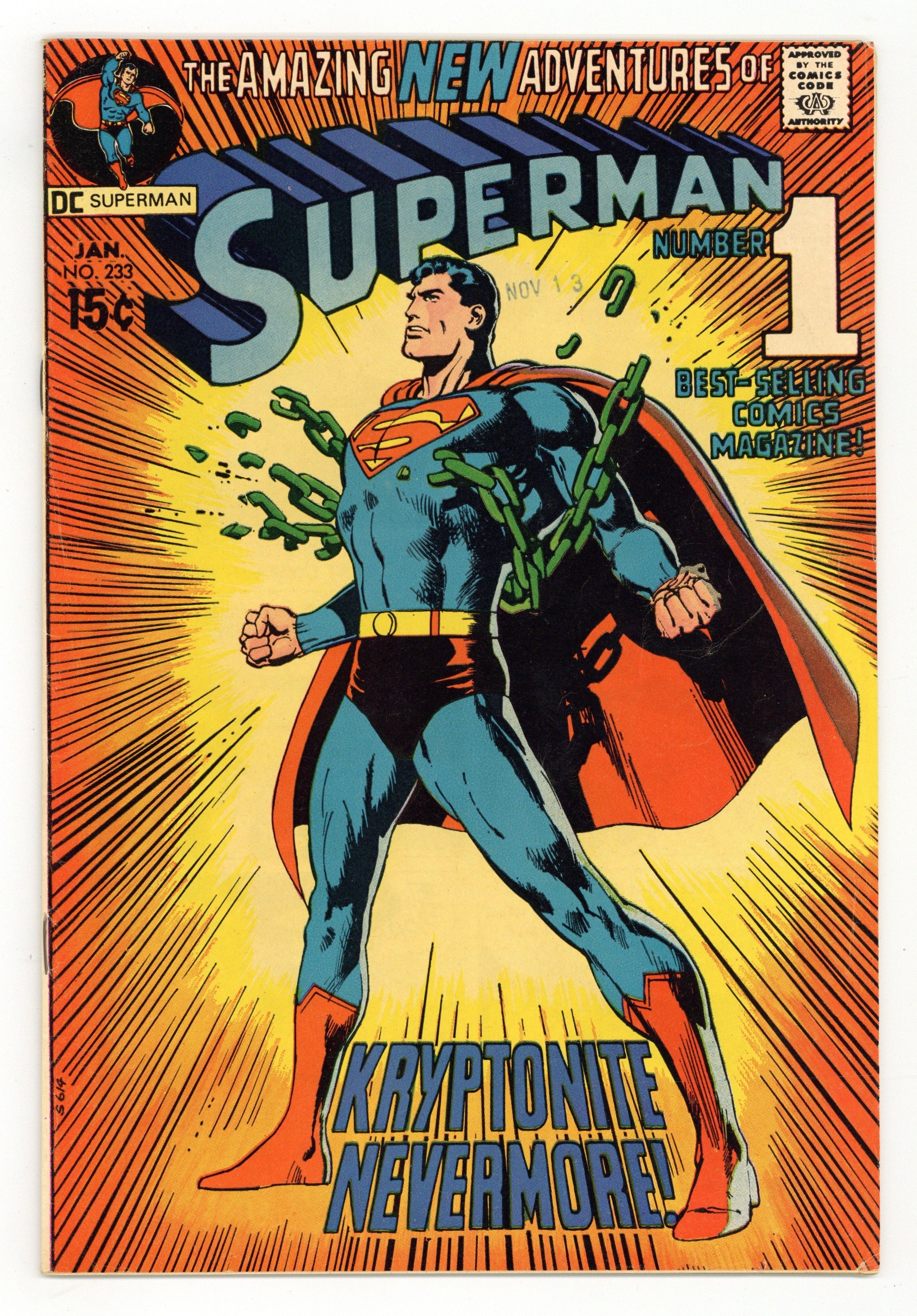 Starts Jan 3 Cover art by Neal Adams. Superman Breaks Loose, script by Denny O'Neil, pencils by Curt Swan, inks by Murphy Anderson; A scientific experiment turns all the kryptonite on Earth to iron, as Clark Kent moves from newspaper to television journalism. Super-Turtle humor page by Henry Boltinoff. Jor-El's Golden Folly--The Fabulous World of Krypton, script by E. Nelson Bridwell, art by Murphy Anderson; Ignoring the jeers of his colleagues, Kryptonian scientist Jor-El experiments with using anti-gravity to aid in space travel. 36 Pages, Full Color. Cover price $0.15.