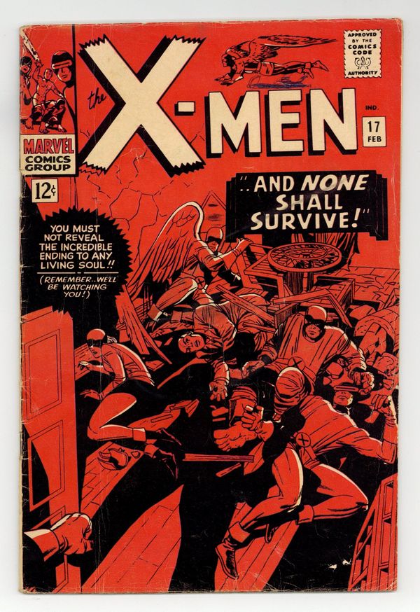 Starts Jan 26 Cover pencils by Jack Kirby, inks by Dick Ayers. ...And None Shall Survive!, script by Stan Lee, pencils by Jack Kirby (p. 1 & layouts, pp. 2–20) and Werner Roth [as Jay Gavin] (pp. 2–20), inks by Dick Ayers; In the aftermath of their battle with the Sentinels, Hank, Bobby and Scott are taken to the hospital with injuries; Iceman is delirious in a coma but his companions recover quickly; When Warren's parents call and say they are dropping by for a visit, Angel flies back to the mansion where he is attacked by a mysterious stranger; Xavier and Cyclops, worried with no word from Angel, also return home and are attacked; Beast and Jean are the last to show up and are also taken down; As Warren's parents arrive at the mansion, they are greeted by Magneto. 36 pgs. $0.12. Cover price $0.12.