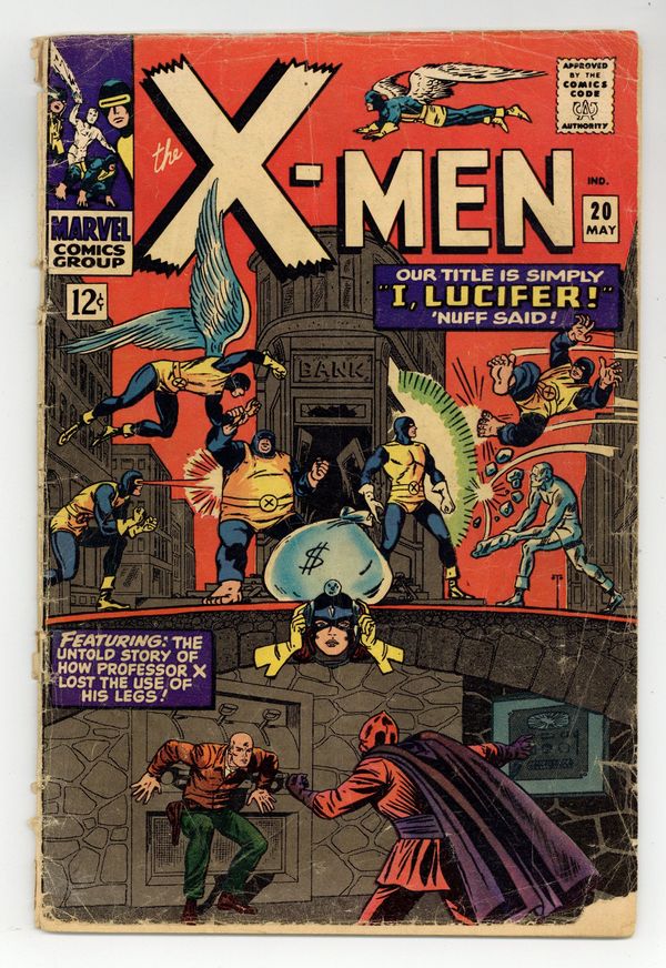 Starts Jan 26 Cover pencils by Werner Roth, inks by Dick Ayers. I, Lucifer..., script by Roy Thomas, pencils by Werner Roth (as Jay Gavin), inks by Dick Ayers; Story of how Prof. X lost use of legs. Continued in X-Men 21. Letter to the editor from comic artist Frank Brunner. 36 pgs. $0.12. Cover price $0.12.