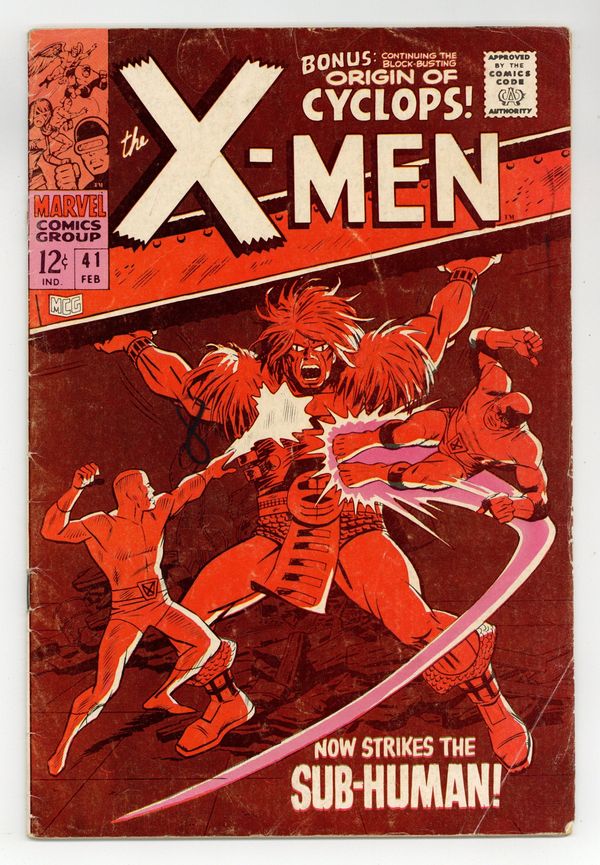 Starts Feb 23 First appearance of Grotesk. Cover pencils by Don Heck, inks by George Tuska. Now Strikes...the Sub-Human!, script by Roy Thomas, pencils by Don Heck, inks by George Tuska; the X-Men battle the Grotesk, the last survivor of the Sub-Humans. The Living Diamond!--The Origins of the Uncanny X-Men, script by Roy Thomas, pencils by Werner Roth, inks by John Verpoorten; Jack O'Diamonds wants Scott Summers to help him battle Professor Xavier; Jack O'Diamonds turns himself into a Living Diamond. 36 pgs. $0.12. Cover price $0.12.