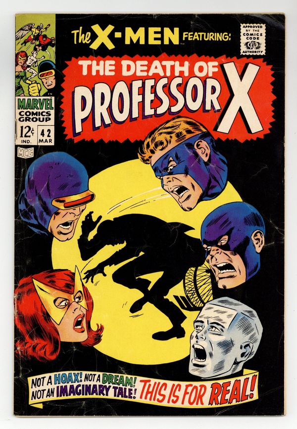 Starts Jan 19 Cover pencils by Jack Kirby, inks by Paul Reinman and Marie Severin (Angel alterations). Trapped: One X-Man!, script by Stan Lee, pencils by Jack Kirby, inks by Paul Reinman; With Xavier's mental powers gone, the X-Men try to decide how they will function without his leadership; Trying to ferret out the X-Men, Magneto has the Toad enter an atheletic event where he leaps to victory; With the crowd turning hostile due to the Toads amazing abilities, the X-Men arrive on the scene to capture him; Magneto snags Angel and whisks him away to Asteroid M; In an attempt to trade the Toad for Angel, the X-Men arrive on Asteroid M where they battle the Brotherhood once again; On their safe return to earth, Xavier revels that his power loss was a ruse to test his students. First Appearance of Magneto's Asteroid M; Prof's loss of powers just a test. Letter column begins in this issue. 36 pgs. $0.12. Cover price $0.12.