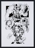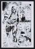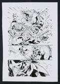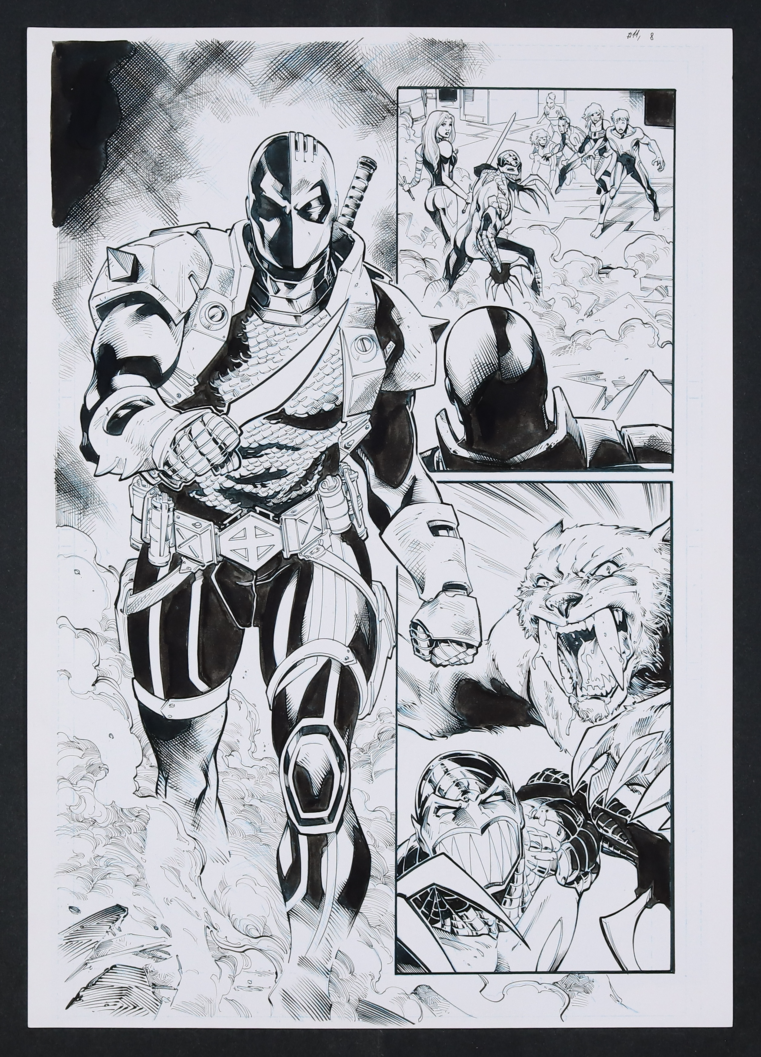 The teen team on the run won't be running for much longer! A phenomenal, full length image of Deathstroke emerging from a cloud of smoke is the gorgeous centerpiece to this great page as the Ravagers (plus Rose and Warblade) are confronted by DC's deadliest assassin. Ink over printed pencils on art board. 11 3/4" x 16 1/2".