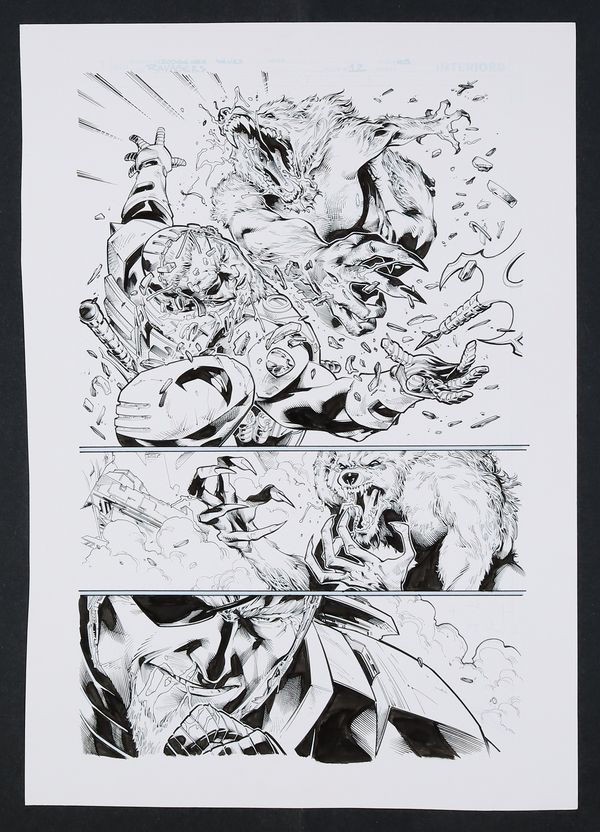 A big, brutal fight page as Beast Boy takes on Deathstroke! The Ravagers have their backs against the wall in this issue but they're not going down without a fight. Beautiful inks from Cifuentes here, perfectly capturing the textural contrast between BB's furry form and Deathstroke's high tech armor. Ink over printed pencils on art board. 11 3/4" x 16 1/2".